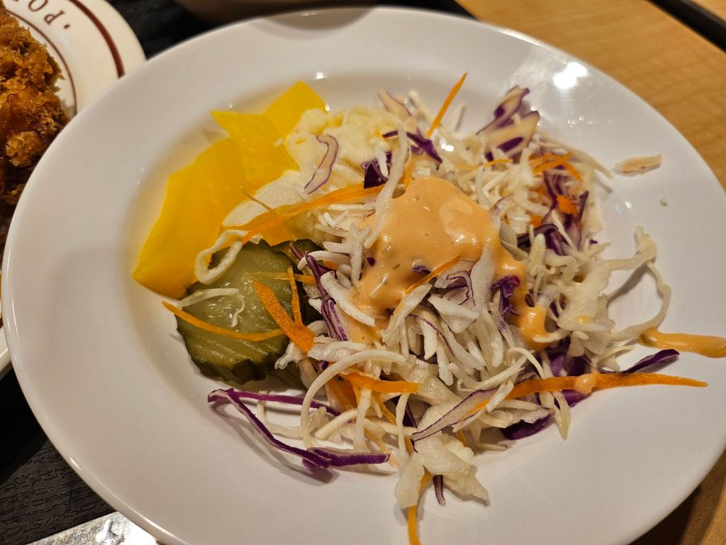 The shredded cabbage is fresh and crunchy with just enough Thousand Island sauce to provide the tangy creamy flavour which can help to cut through the oil of the fried katsu. The pickles on the side also go well with the katsu giving it an additional layer of tangy and savoury flavours