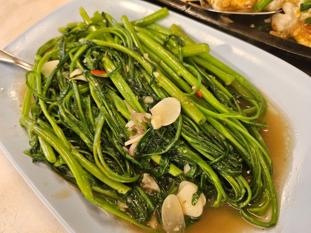 Commonly found in most restaurants is the stir-fried morning glory which is cooked in generic garlic and soy sauce with specks of red chilli. The vegetable is well cooked with the crunchy texture of the vegetable still remaining but without the raw taste of the vegetable. The flavours are simple but well-balanced to give the vegetables a light and balanced taste