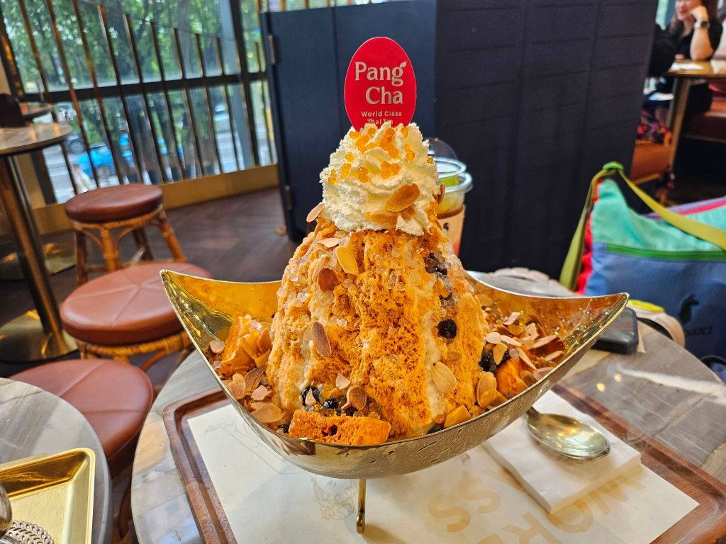 I was checking out the new Emsphere mall when I really wanted to sit down and grab a drink and rest my feet at the same time when this extravagant-looking cafe attracted me. Housed in this glittering 2-storey cafe with seats on both the ground floor and 2nd floor, Pang Cha is one of the newest kids in town offering a huge variety of traditional Thai milk teas and fusion teas and Thai milk bingsu