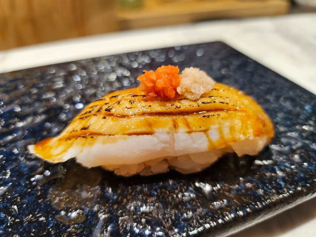 The next few courses included a sashimi roll, a snow crab patty fried in panko crumbs, seafood trio toast, and grilled Tachiuo. The roll was nice with fresh fish, but the flavour was kind of mixed up, so I could not differentiate the tuna from the other fish. The snow crab patty is nice and well-fried and the plating was also very nicely done up. For the dish on the toast, I found the toast slightly soft and soggy