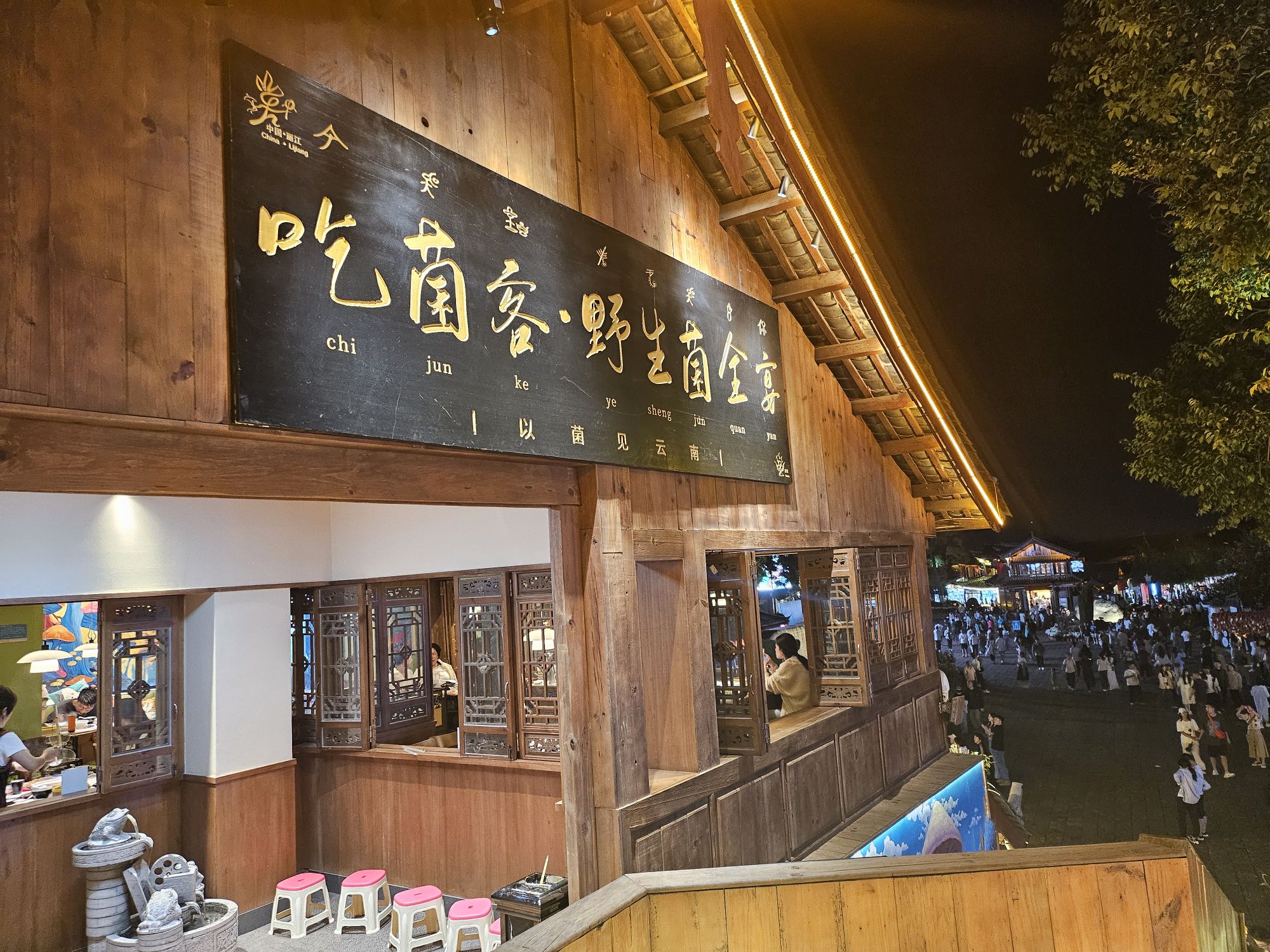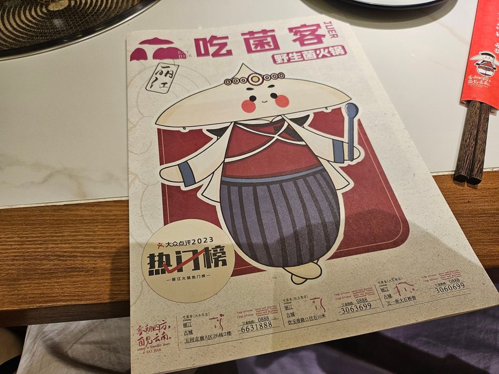 With too many choices, we asked our hotel concierge for his recommendation and he suggested visiting the restaurant 吃菌客 ( loosely translated as Eat Mushroom Guest) as they have a very clean environment as well as respectable supplies for their ingredients. Located in the main square next to the waterwheel, it is easy to locate the restaurant. There are a few branches but we went to this main branch which has a nice view of the town at night