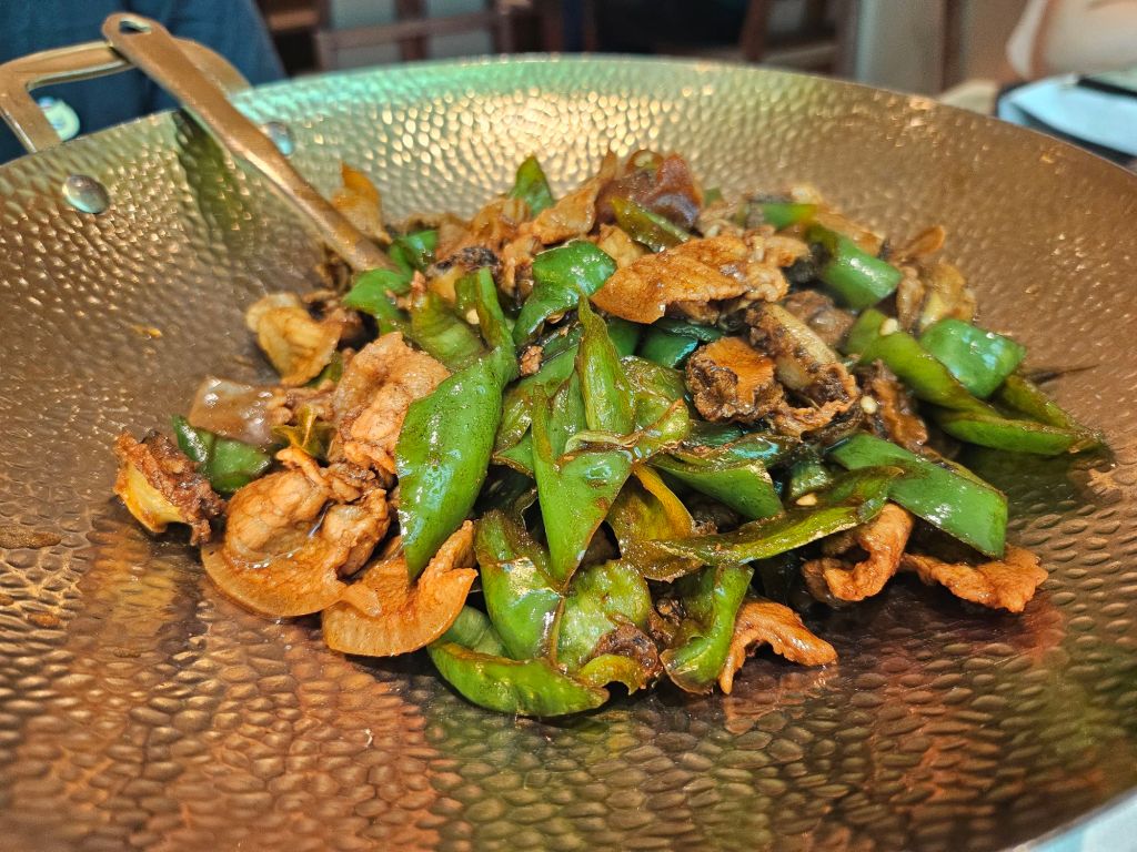 The next dish attracted me due to the colourful picture; spicy chicken offals was fried with chilli and preserved green long beans and fresh chives. The dish was too spicy for me, and I had to take sips of water in between to manage the burn. There was a good mix of savoury and sour notes from the offals and long beans, which made this a unique dish. In terms of texture, the crunchy offals matched well with the soft beans
