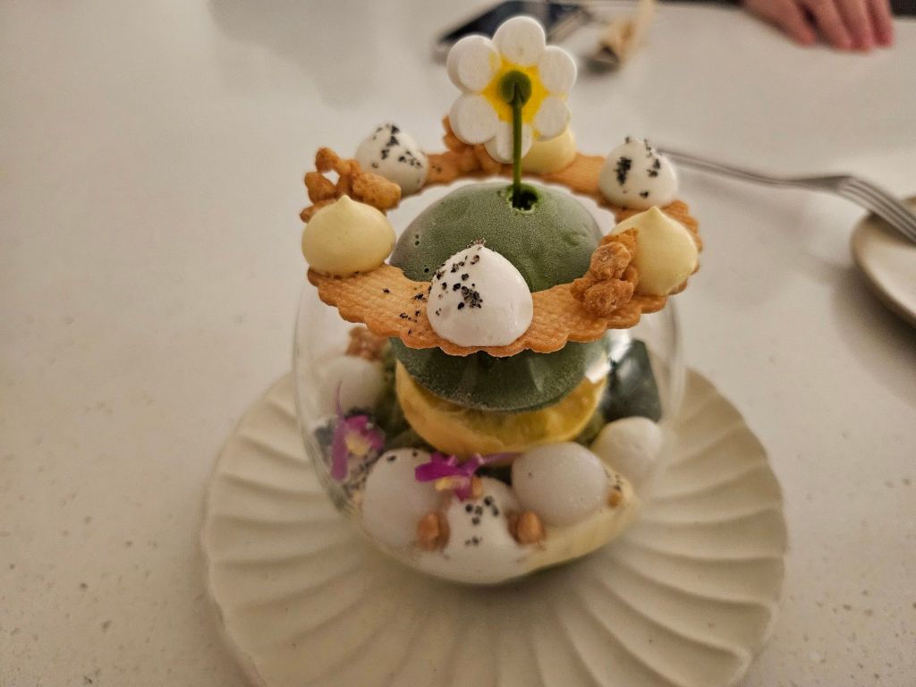 We also had the matcha parfait, which was Laila in another form. You can see the black sesame used here as decorative powder, and the mango used as a mousse base for the matcha ice cream. With the same flavour profile as Laila, this version is a lot lighter as the main mousse cake was replaced with a bittersweet matcha ice cream. This was also a pretty dessert to eat as each flavour is deconstructed and can be eaten separately or together