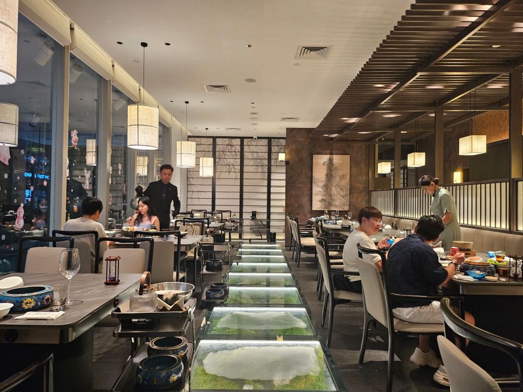 With a refined name as 享月汤皇 ( Xiang Yue Tang Wang ) loosely translated as Soup Master admiring the moon. The restaurant is decorated in dark wood, classy wooden panels, and glass walkways on top of planted greenery. Half of the restaurant is dedicated to smaller private rooms, which are decorated like a bespoke Japanese restaurant with their wood and cloth doors