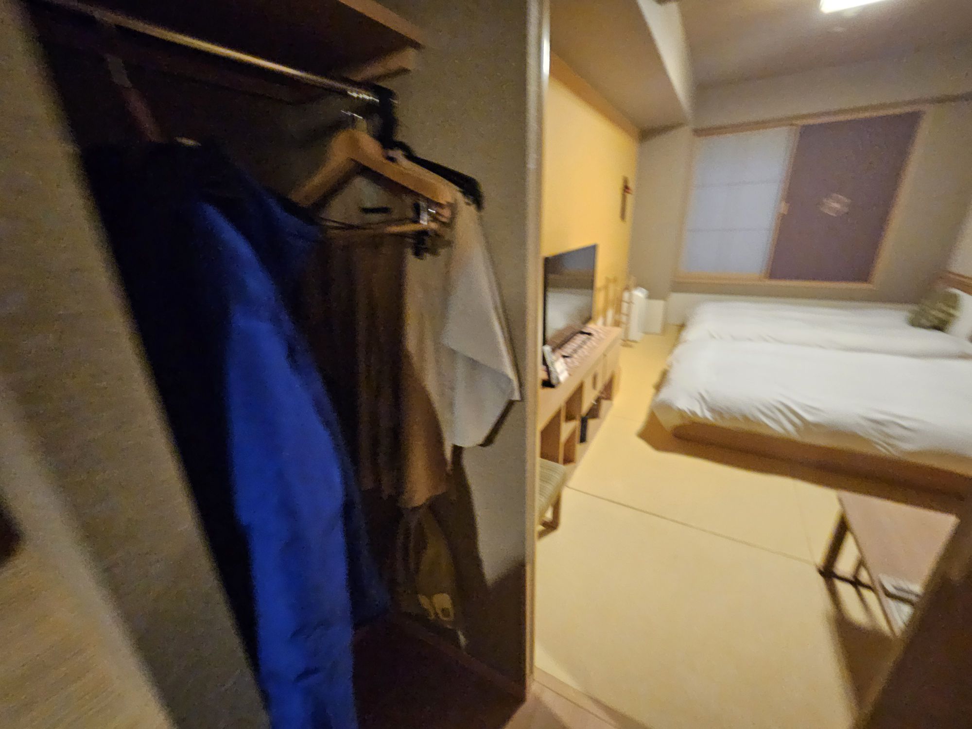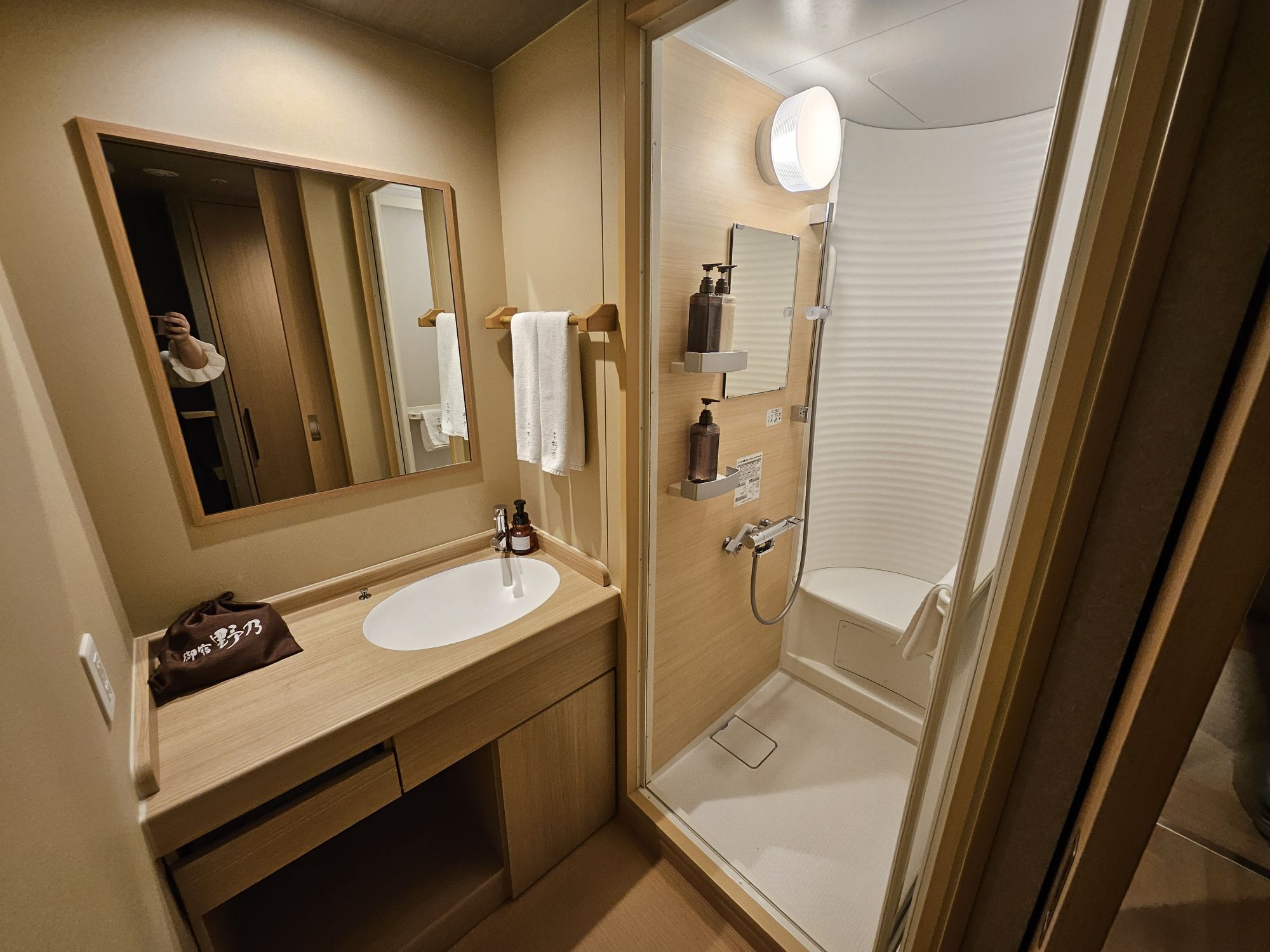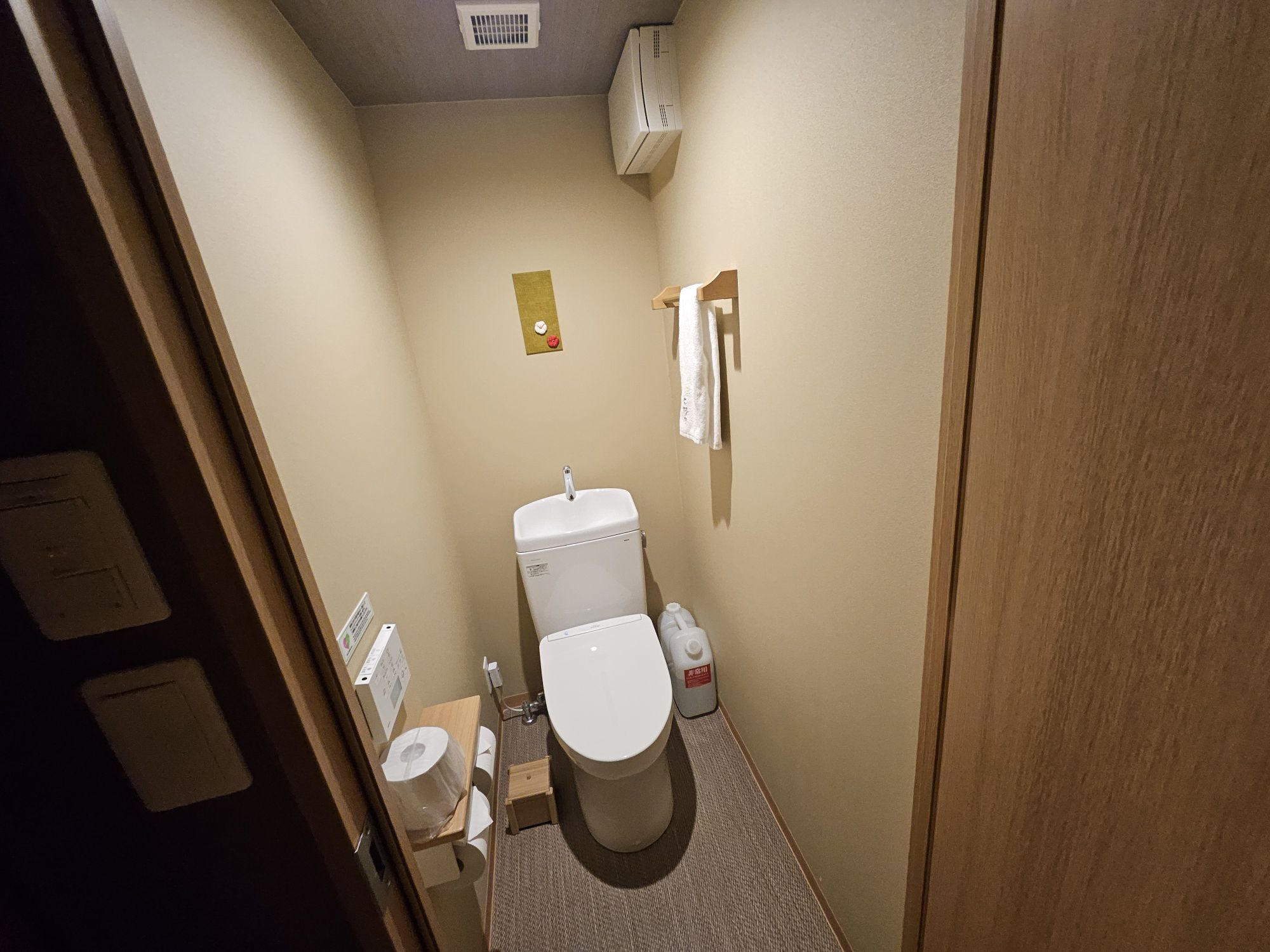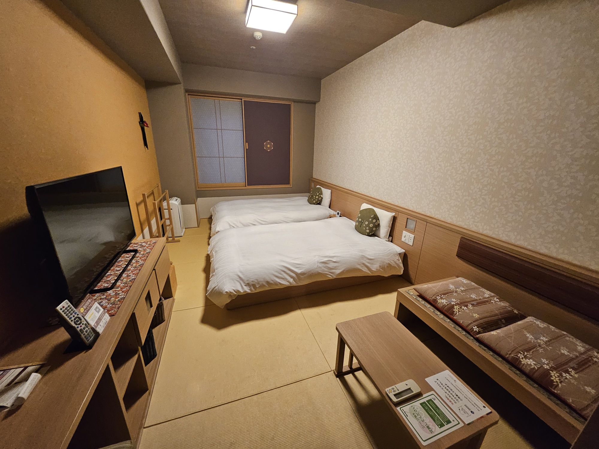 The moment you enter the room, you will pass a small corridor area with a storage cupboard for luggage, a coat cupboard for your jackets, amenities for the bath and toilet, and the mini bar fridge. To the right of the space is the small toilet, which is separated from the bath and has a small tap for hand washing. The bath area is a small cubicle with a showerhead and sitting space, while the wash basin is set outside the bath capsule. Both rooms are quite small and can be quite claustrophobic for larger-sized customers. The main sleeping area is quite spacious, with 2 low Western beds, a sitting area with cushions and a coffee table. I chose a Western bedroom vs a Tatami room, and this was one without windows, which was cheaper in rates. The beds are relatively soft but still provide acceptable support, but the pillows were way too flat and soft for me