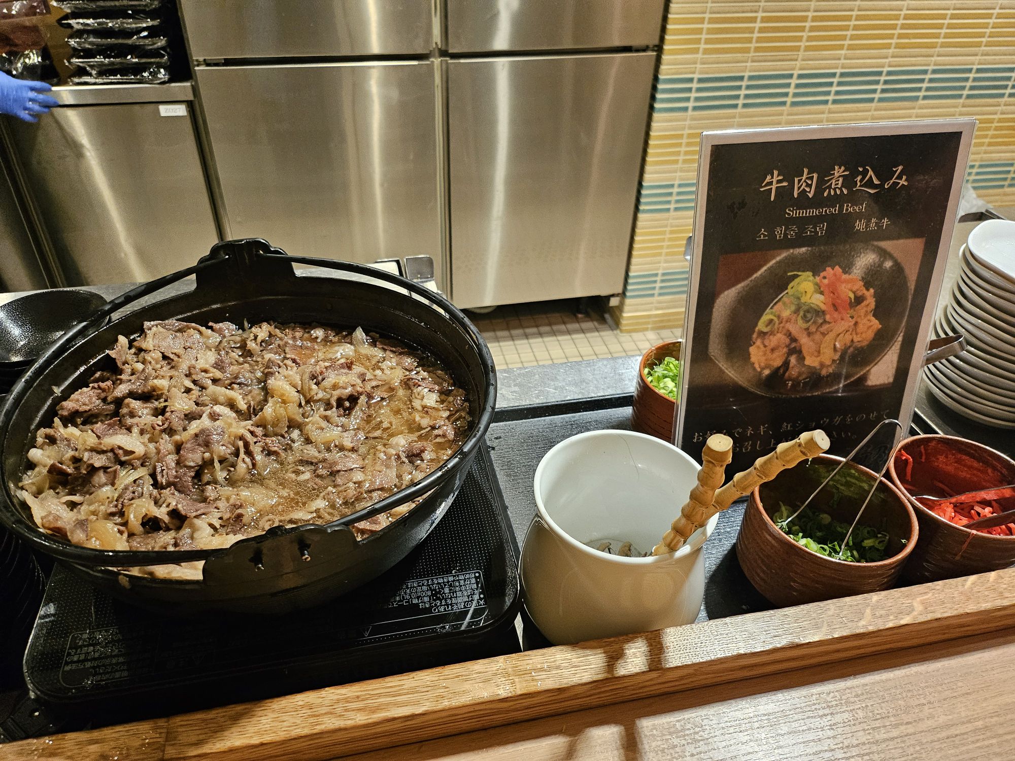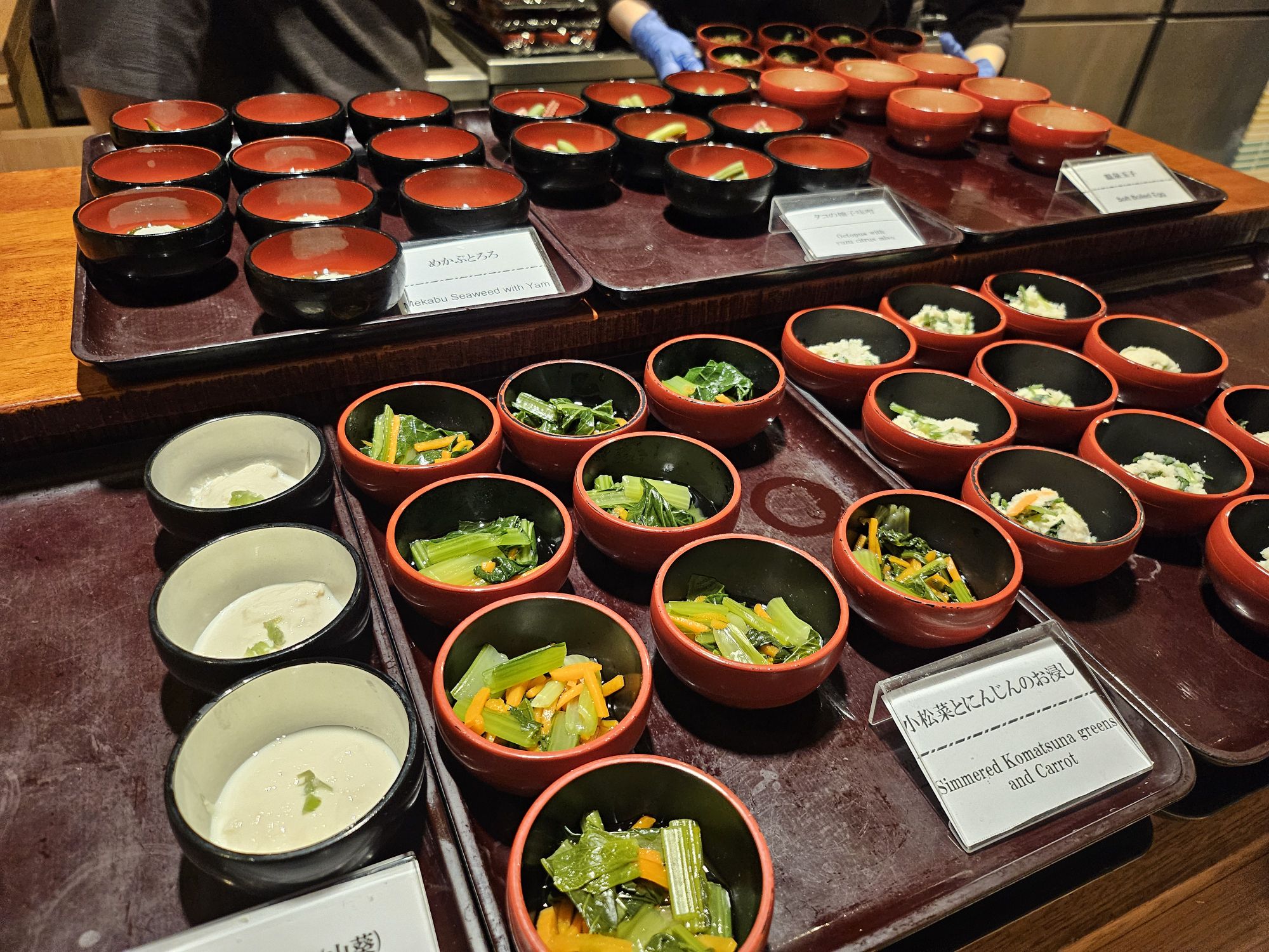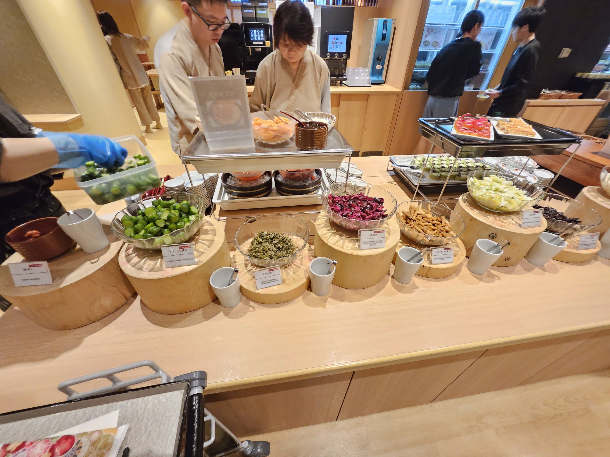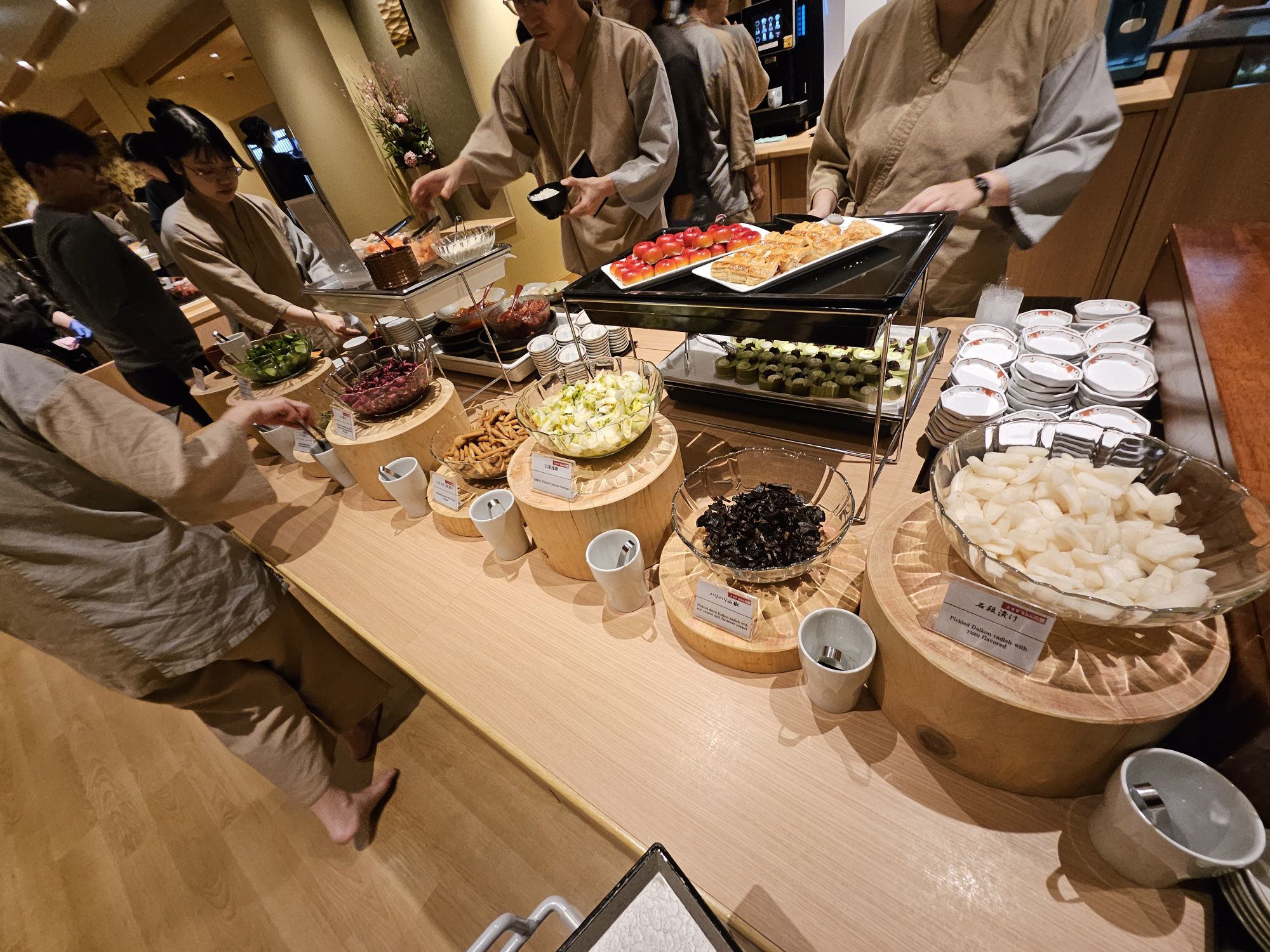 Next is the highlight of the stay, which is the breakfast. One of the main reasons I booked this hotel is due to the breakfast. I booked rooms which came packaged with breakfast, which cost about SGD 20 to 30 more per night. On our first morning, we went down for breakfast around 8am, and it was already very packed with ushers assigning us to tables to help with the flow of customers. Signs were put up to ensure all customers follow the flow and no jumping of the queue is allowed. You start the queue by picking up a tray or trolley with 2 trays and approach the first station, the pickled station, which has a wide array of pickled vegetables like cucumber, radish, plum, seaweed, bamboo shoots and more. The next station was the small side dish station with items like natto, chawanmushi, miso soup, chilled tofu, seasoned sesame vegetables, potato salads, etc. The next station was a big pot of braised beef with onions, which I skipped