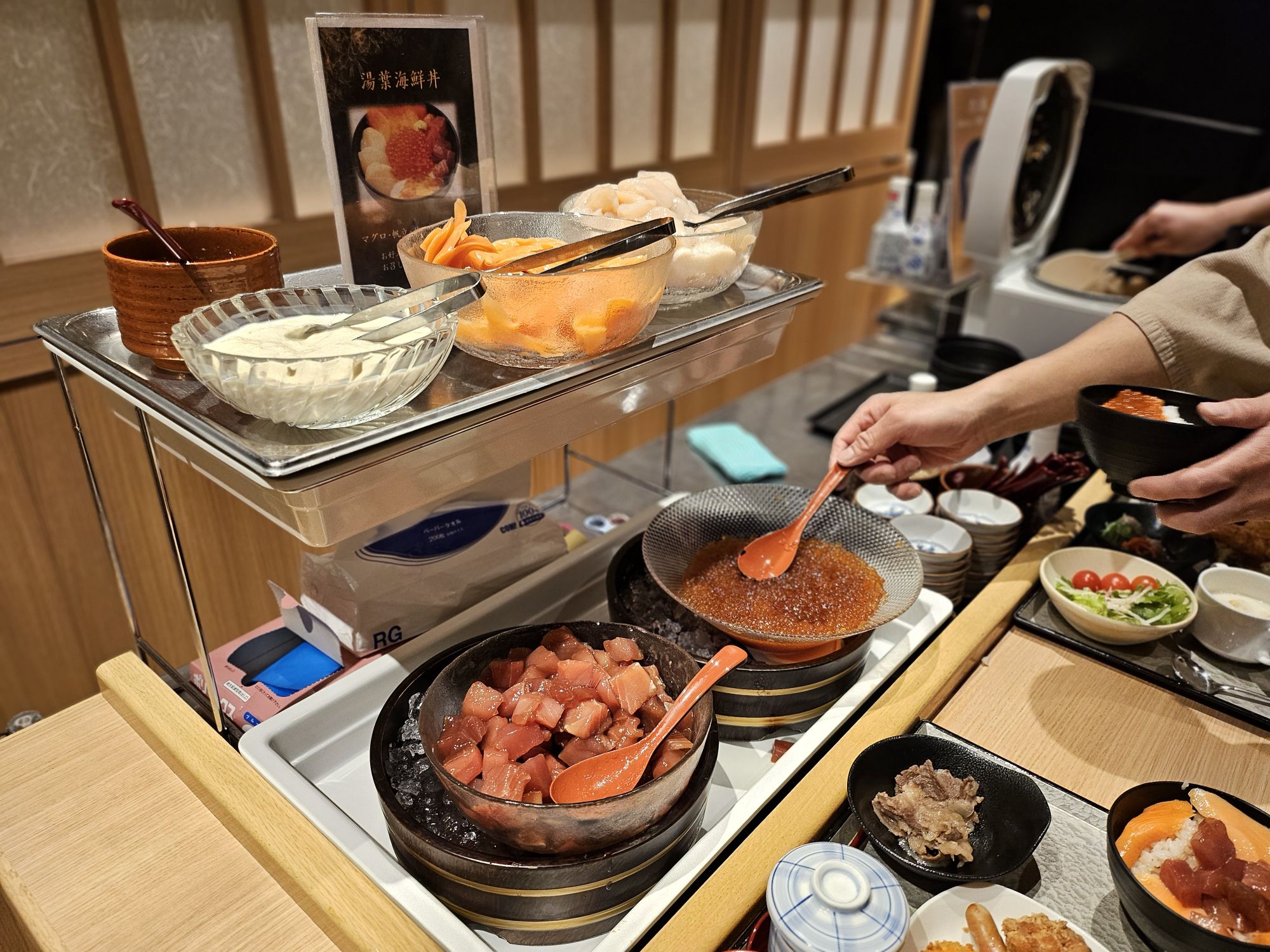 The next section is the grilled food, including miso fish, pan-fried mackerel, salmon, and egg rolls. The next section, which really attracted me, was the live frying station for tempura vegetables and shrimp, which came with grated radish and dipping sauces. The next section was quiet, as it was the salad, fruit, and bread roll stations. Next station includes the Western delights like scrambled eggs, fried nuggets, sausages, hash brown, fried ebi and sunny side egg. The last station is definitely the main highlight for me and the main reason why I booked the breakfast package. This was the free-flow Chirashi don station with fresh salmon, tuna, ikura, whelk and scallops with grated Japanese yam