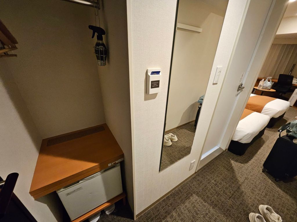 Right at the entrance of the room is a small storage area with a full sized mirror and some hangers for your clothes