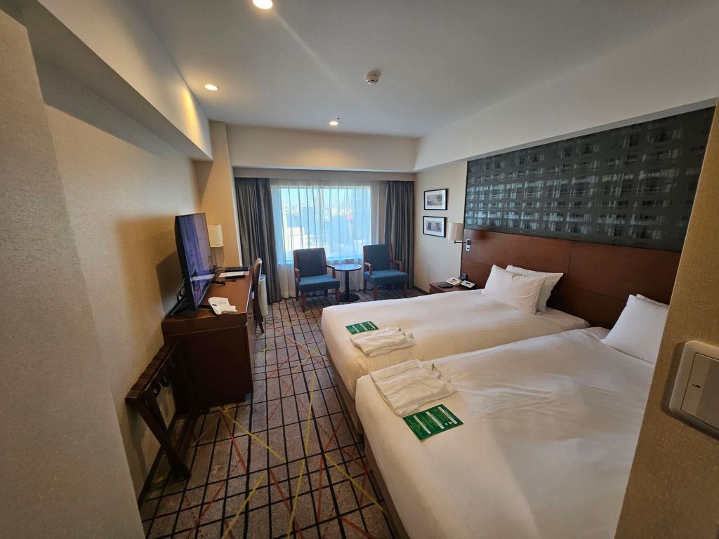 I was pleased upon entering the room, as it was very spacious and bright. The 2 beds were placed next to each other, closer to the bathroom and toilet side, making room for a good space near the window for either eating or chilling. The layout is dated, but well-maintained enough to feel comfortable for the stay. The mattress is semi-firm, but the pillow is too soft for me