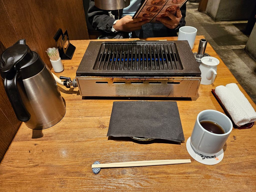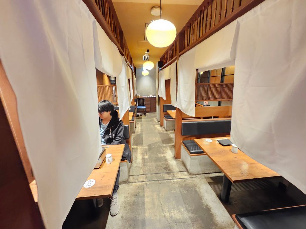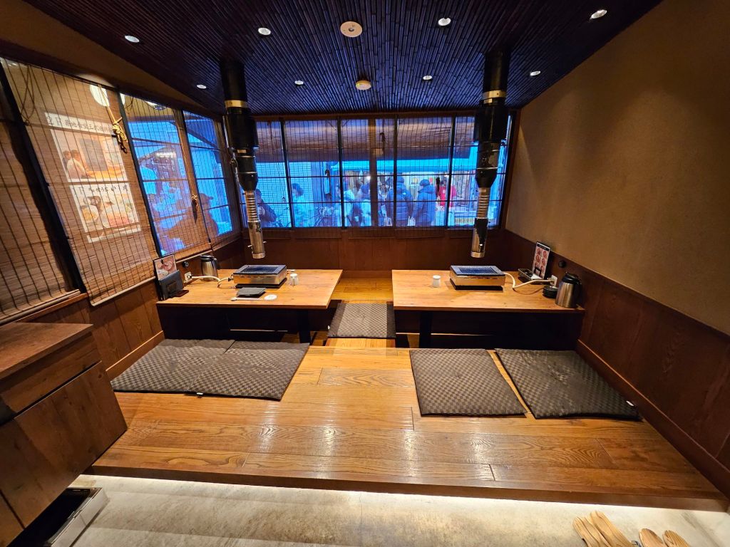 When I came back to the restaurant, their doors were open and we were one of the first to walk through the doors. Most of the restaurant space was separated into booth seating, with 1 area for bigger groups and a shaded view of the Tsukiji Market crowd outside. Each booth seat has its privacy with white cloth blinds, although you can still see through to the next table as they don’t pull down the blind fully, especially when they are grilling the fish
