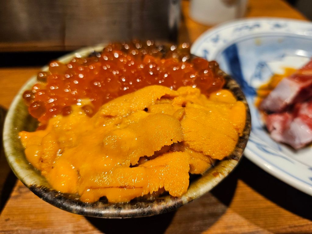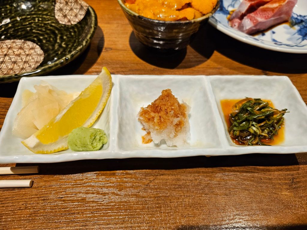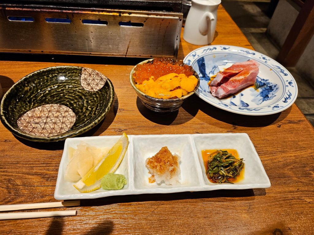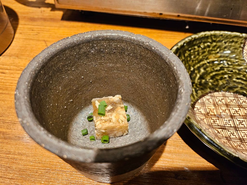 They have a total of 4 set meals as well as à la carte orders. You can book your table and view the menu here. We ordered the most expensive set, which included items like the Ikura and Uni bowl and grilled tuna. Each table had a small grill in the centre where the staff would cook and serve you the dishes. The course meal started with serving us the different sauces to be eaten with the other courses, a jellied fish tofu, the overflowing Ikura and Uni bowl, as well as a thick slice of tuna belly