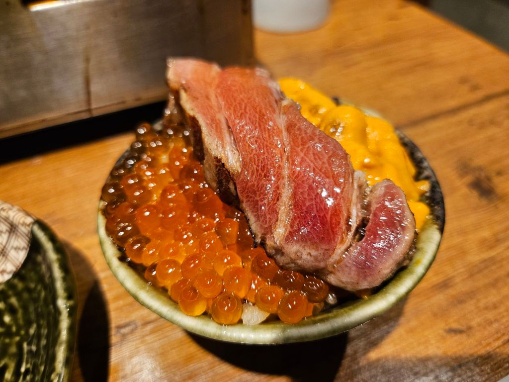 A close-up look at the fatty tuna, which was wonderfully marbled with fats well distributed throughout the meat itself. It was cut into a thick slice, which would have been too thick to eat raw. The small rice bowl was topped full with sea urchin and Ikura, which were perfect with one another, giving out an ultimate burst of umami flavours. Once the tuna was perfectly seared, the chef put it on top of the rice bowl for us to enjoy together. The surface of the tuna was seared well with a nice smoky flavour, while the juicy and creamy centre of the tuna melts in your mouth, giving you a decadent, oily yet enjoyable mouthful. It was very weird as the perfect marbling and searing gave the fish a meaty flavour and texture