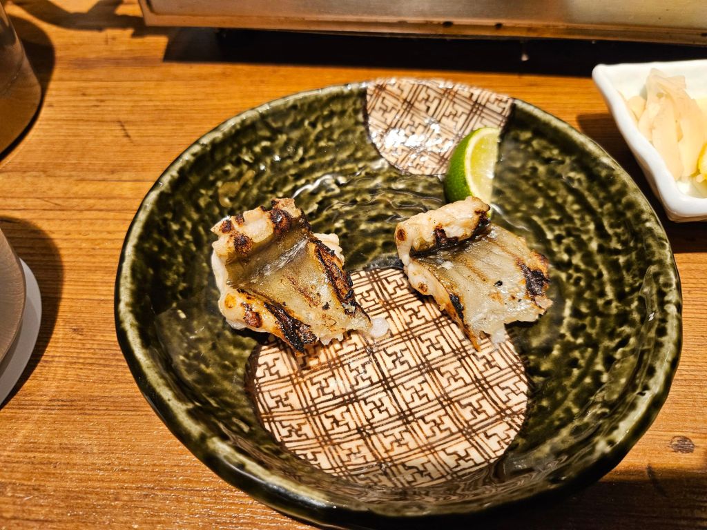 The next course was a thinly sliced sea bass sashimi, which was subtly sweet and refreshing after the fatty tuna. The next few courses were different types of fish, which were also grilled in front of us. As each type of fish is being grilled, the Chef will try their best to explain to us in English and also the best way to enjoy them with the sauces provided. Some of the fish and seafood carried the charred flavour well and were drier compared with the fatty tuna, but they were equally enjoyable and would do well with alcohol