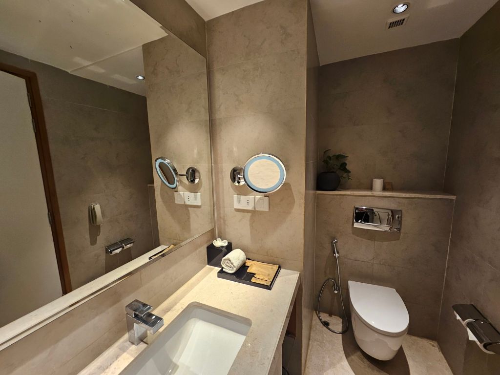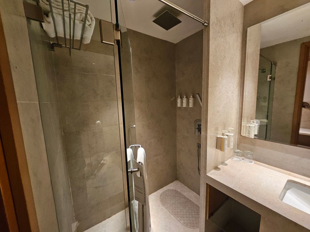 The bathroom was spacious with a good separation between the wet and dry areas. Basic amenities were provided, although the towels were clean, you can tell they are kind of dated, where the terry cloth material was flat and rough, needing a refresh