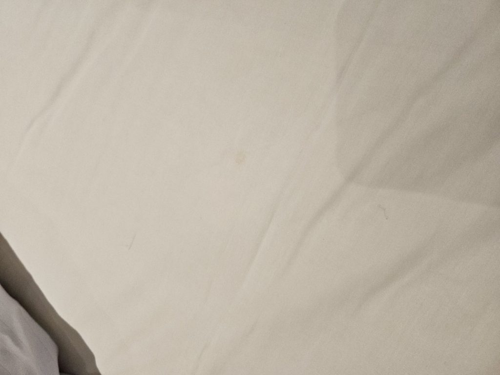 When I finally returned to my room and prepared to sleep, I opened the comforter to this not-so-pleasant surprise. The yellow marks looked like old stains, but I did not want to touch them to find out if the sheet was clean. It was quite late at night, and I was only there for 1 night, so I did not request a change of room. Instead, I slept on the side of the bed where the sheets were visibly white and clean, which is quite uncomfortable for me