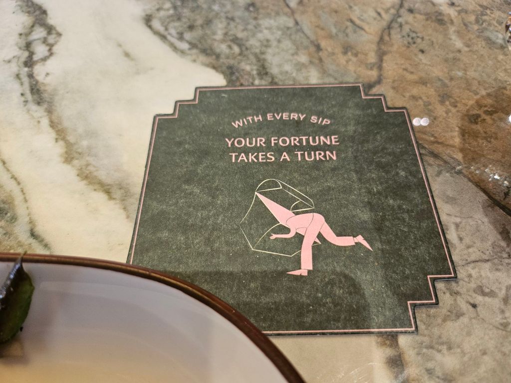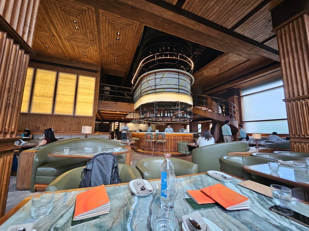 Stepping inside the restaurant, it transforms into a different atmosphere, complete with plush armchairs and a breathtaking bar that takes centre stage in the indoor space. Complete with marblised tables and engraved wood pillars, and warm lights, the vibe was like an opulent bar in the Gatsby movie