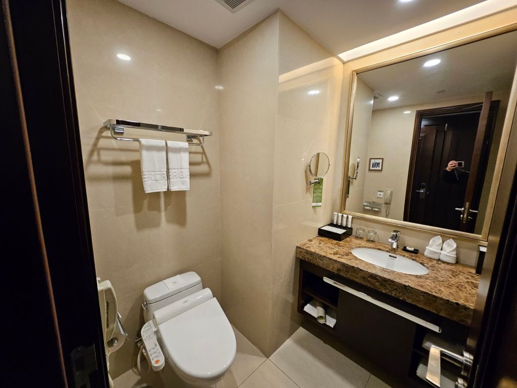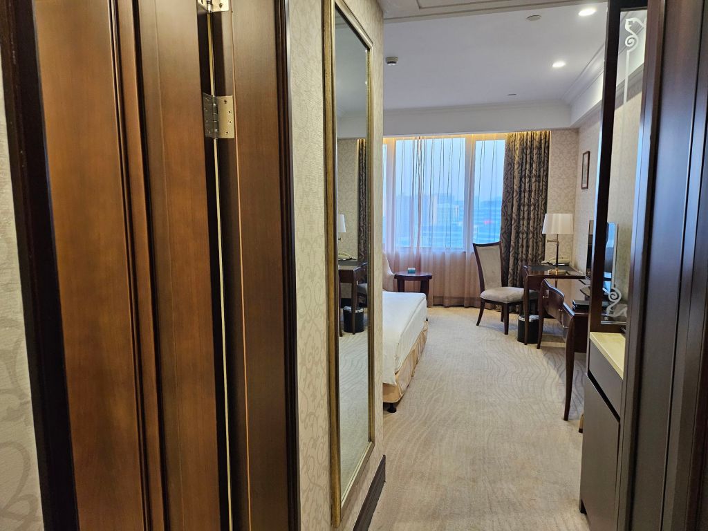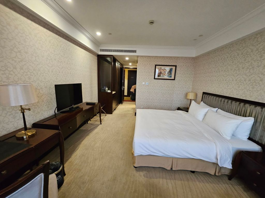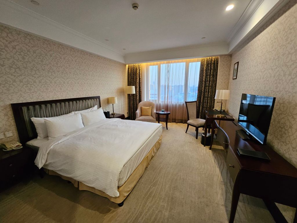 The room is spacious with a huge king-sized bed, a working desk, an armchair sofa and a side table for resting. The overall decor is dated in style but maintained well in terms of condition, and everything is kept clean and well. The furniture is also a mix of Chinese style and modern style, which fits well into the aesthetics of the room. The bed was soft but acceptable for me, and the multiple pillows given allowed me to mix and match them for the perfect height