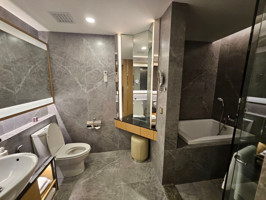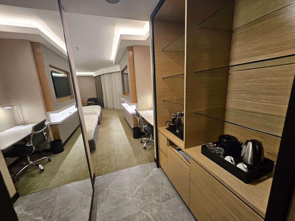 There is a huge cabinet area right at the entrance with a full set of coffee-making appliances and a small bar fridge. The bathroom is also very spacious, with a square bathtub and a separate shower area. There is also a makeup dressing corner with bright mirrors and a cushioned stool, which is not usual in hotel rooms