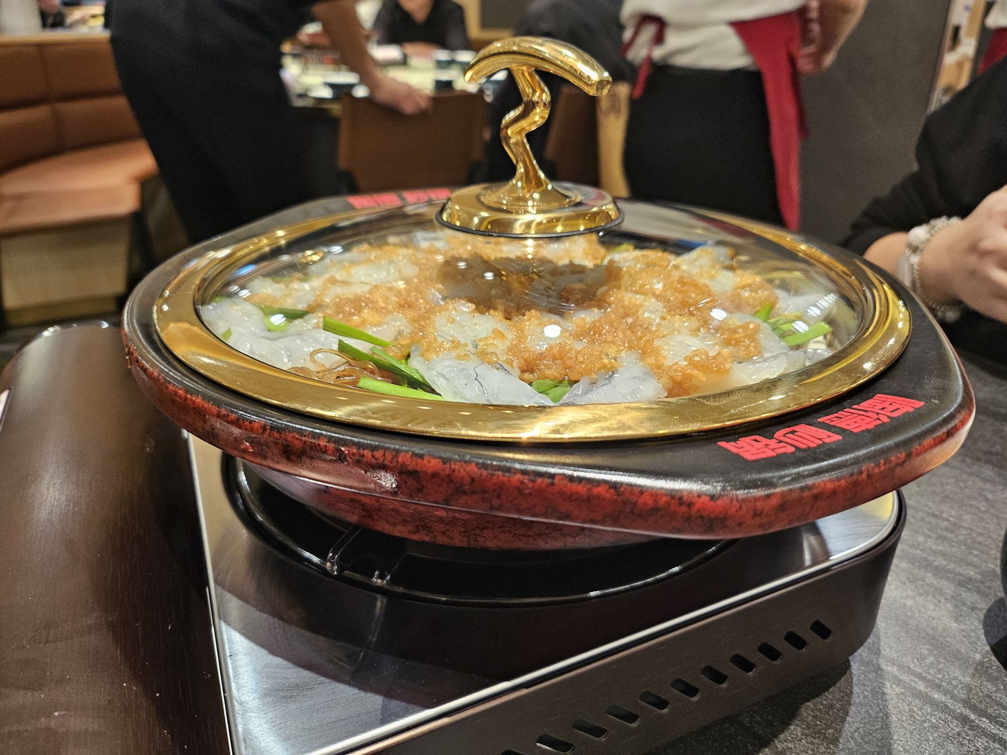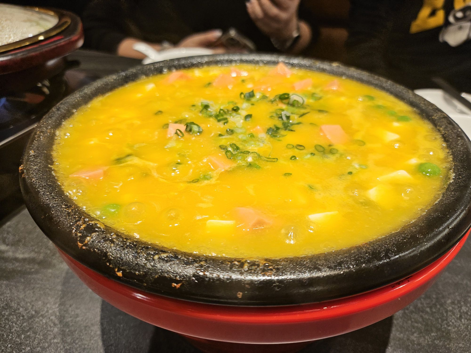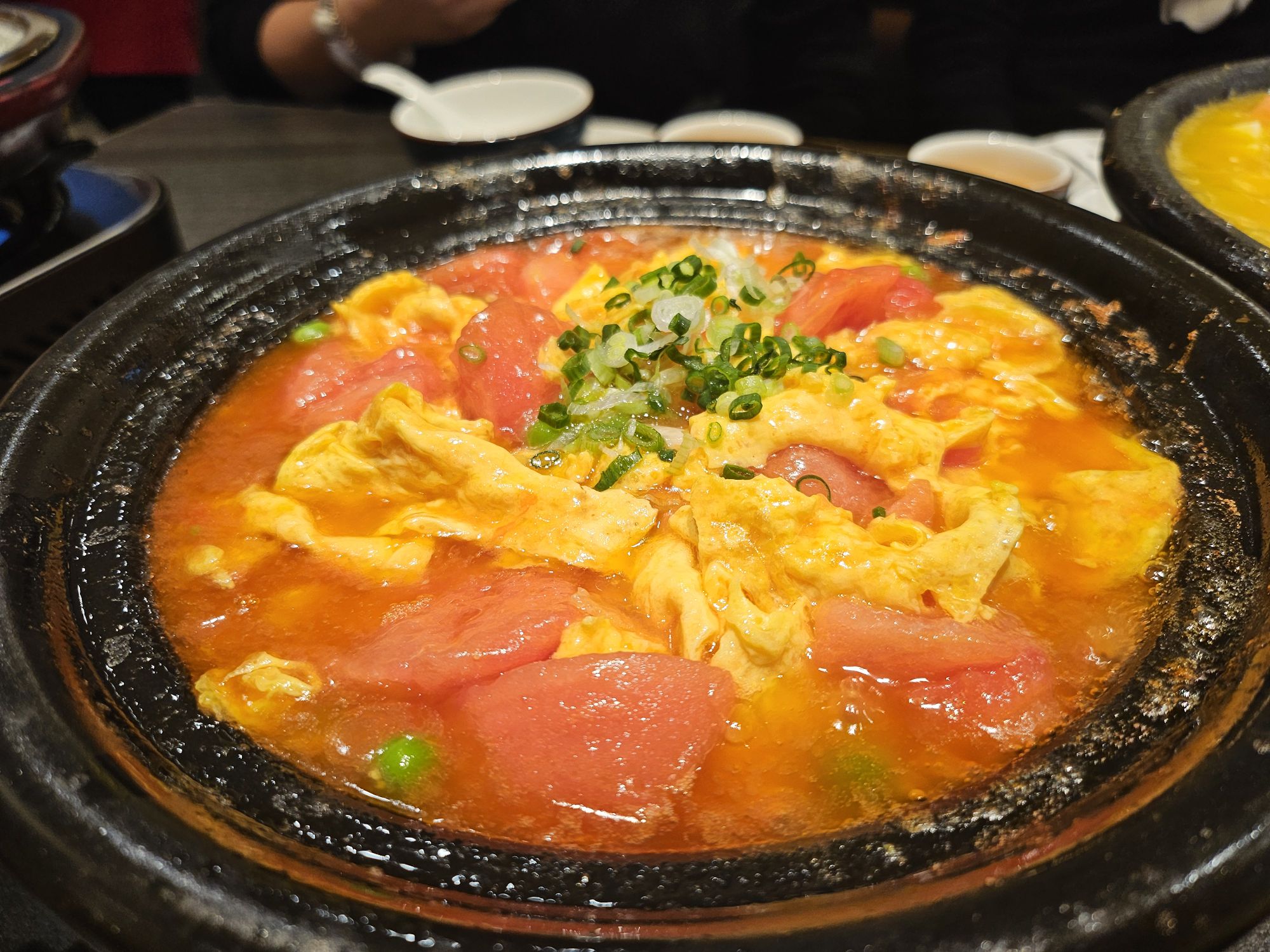 While waiting for our prawns, other dishes also arrived, like the light blanched kai lan, boiled lettuce with corn, tofu and ham, thick broth and tomato stir-fried eggs. Almost all of them were served in a kind of claypot, which kept the dishes bubbling hot when they reached our table. Both vegetables were very light in flavour but were savoury enough to pair well with rice, and were great for our friend who couldn’t take spicy food at all. The tofu and ham broth, and tomato eggs were delicious and basically made us eat a lot of rice as the gravy was savoury and addictive for the broth and tangy and sweet for the tomato eggs
