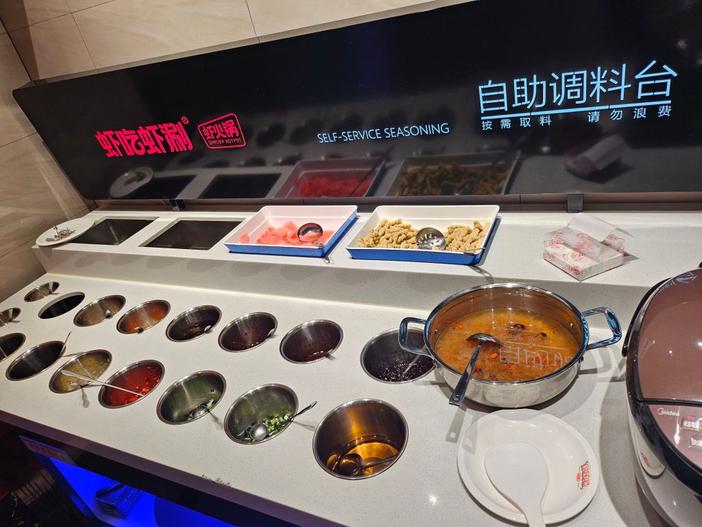The restaurant was empty when we entered, as most of the other restaurants were having a break before dinner time. The staff was very nice and welcoming, and offered to introduce their dishes to us while other restaurants were pretending not to notice. They have a small condiment bar area where customers can get cut chilli, spring onion, minced garlic and more for their hotpot