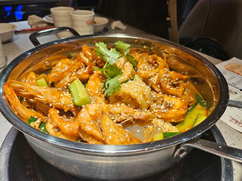 We chose the mildly spicy version, which came with vegetables like cucumber, corn and parsley. The dish itself is sweet, spicy and savoury, which is quite good when paired with rice. There were quite a lot of prawns given in the pot with half a pot of gravy, which was quite salty if drunk on its own. The ingredients were generally ok, although not the freshest; you can tell from the texture that they are probably frozen prawns
