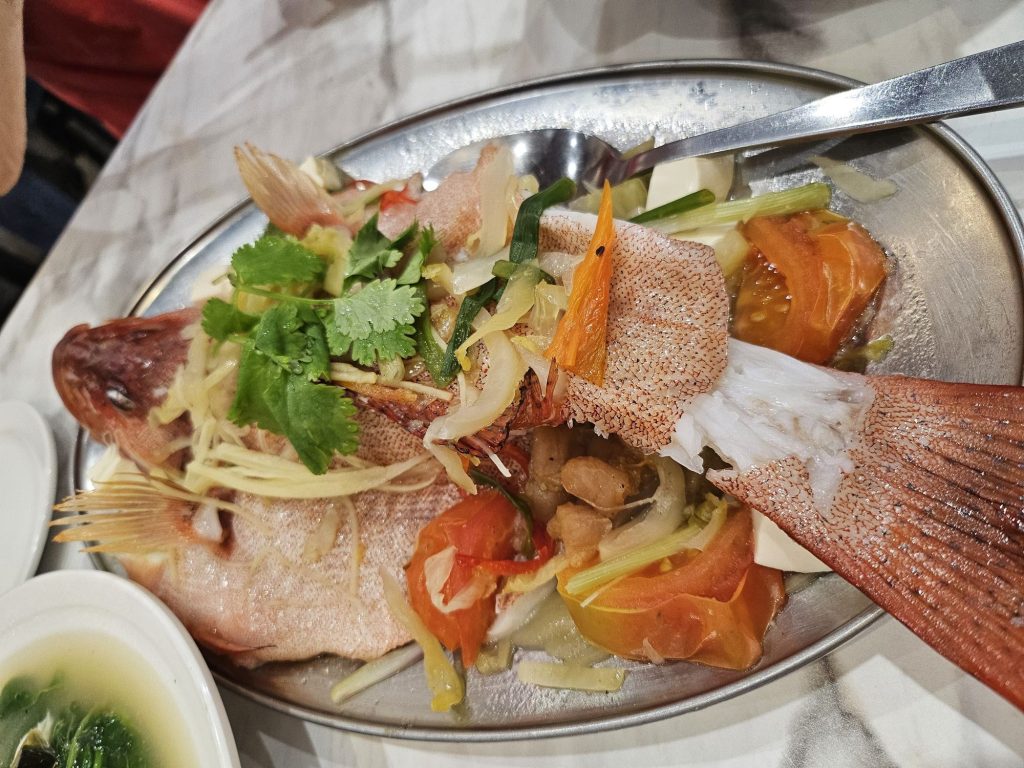 We ordered some of their signature dishes, like the steamed Teochew red grouper, which was cooked in the traditional Teochew style with salted vegetables, sour plums, tomatoes, tofu and ginger. The fish was fresh and sweet, and well complemented by the garnishes used while steaming the fish