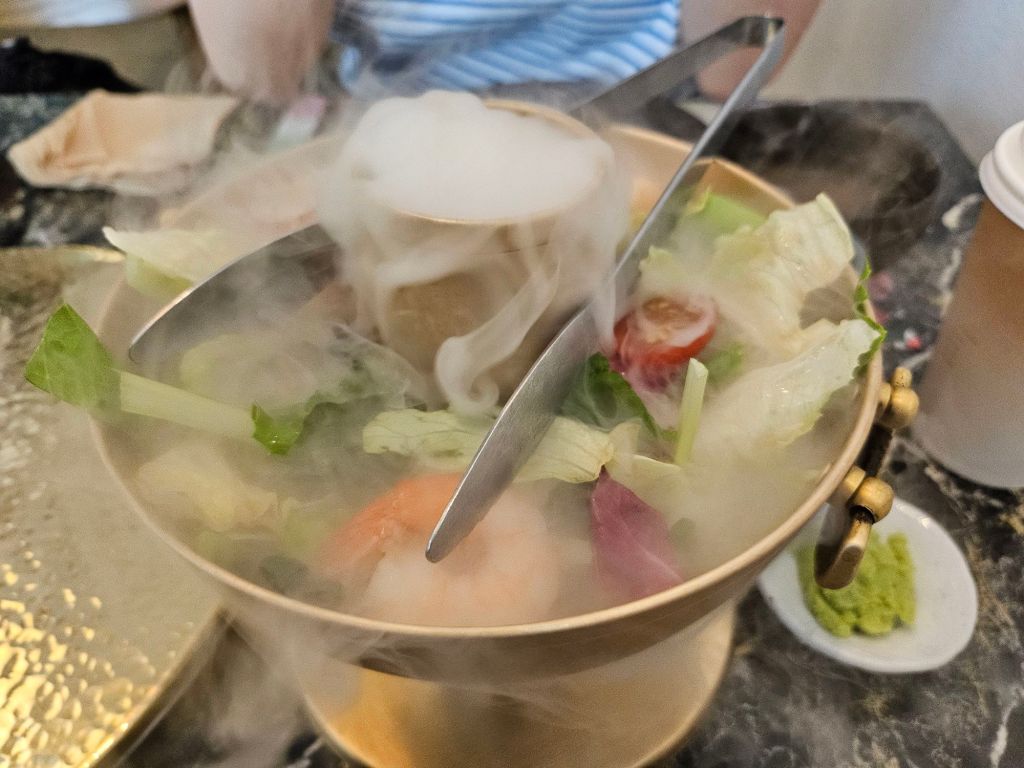 The first dish was salad, but served in a dramatic brass hotpot with dry ice smoke mimicking steam from the hot pot. The salad was basic greens with some shrimp and served with a light citrusy sauce, and was great to whet our appetite for the start of the course