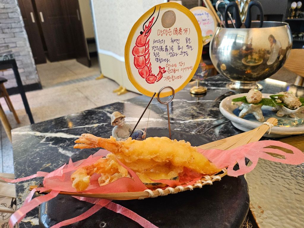Next dish was the deep-fried shrimp served in a little bamboo boat, complete with a fisherman decoration which held up a hand-written sign describing the dish and wishing the diner well. The shrimp was freshly fried with no greasy bite, and the batter was thin and just lightly crispy