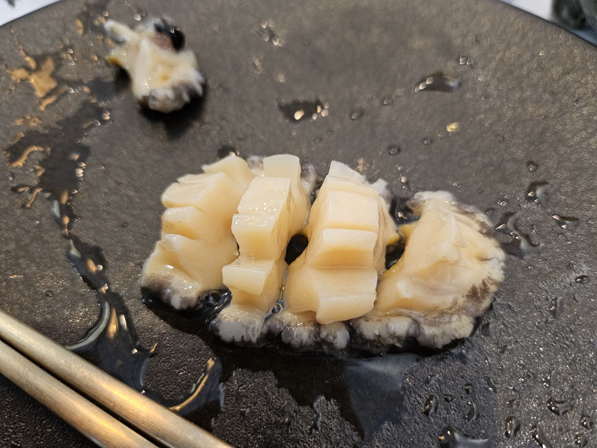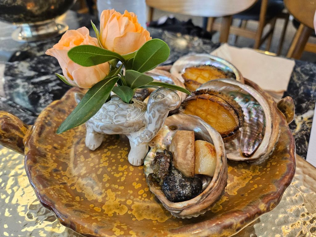 The next dish was the grilled abalone, which was also beautifully plated in its shell and a earth toned plate with another tortoise and flower arrangement. The abalone was grilled nicely with a light char, and the texture was crunchy while the flavour was sweet and full of umami. The original flavour of abalone is not very strong, so the grilling adds to the flavour nicely
