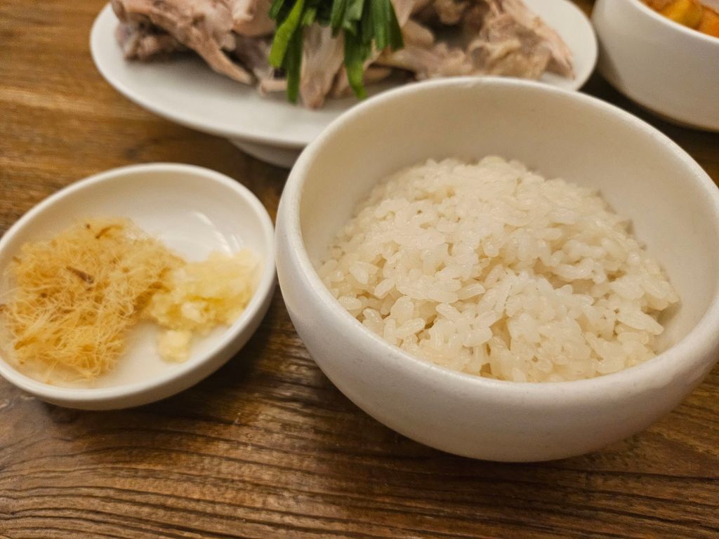 The samgye baekban, which is the ginseng chicken set, consists of a bowl of rice, a plate of boiled chicken, and a serving of condiments like shredded ginger, a side of spicy radish leaf and the main thick ginseng broth. First taste was the broth, which was very thick and creamy, and I think I could taste some perilla leaf flavours. It was a very clean chicken taste, but it can fall 1 dimensional. I personally don’t mind it, but my friend still prefers the usual style of broth. The boiled chicken was slightly bland and needed seasoning or dips, but the meat was extremely tender and fell off the bone. The spicy radish acts as a palate cleanser and also adds some depth to the meal