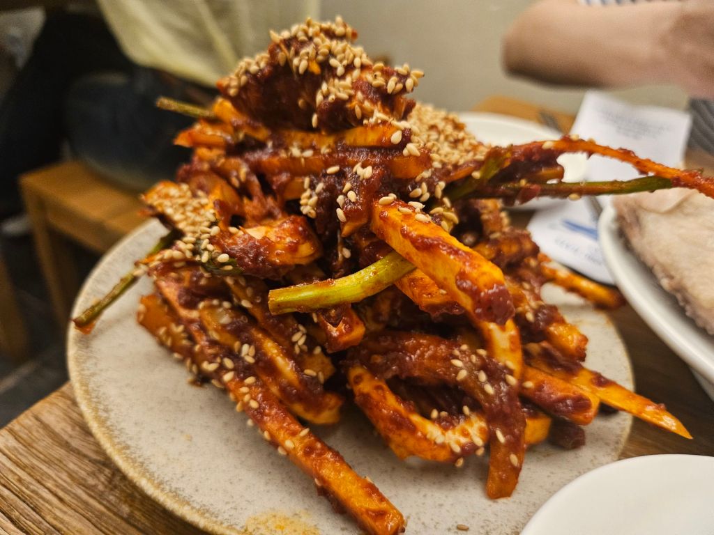 Since we saw this on everyone’s table, we decided to order 1 portion for sharing, which is recommended to go well with our samgye baekban. For me, this dish was a new and refreshing flavour, but too spicy. The squid was crunchy and paired well with the chicken meat, but I found the chilli paste too overpowering as it coated the dish extremely well. I had to wash off some part of the chilli to enjoy the dish better. Since the boiled chicken was bland, this was a nice add-on to eat with the chicken