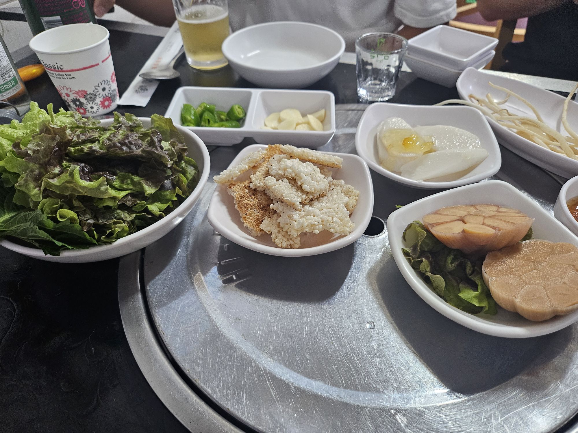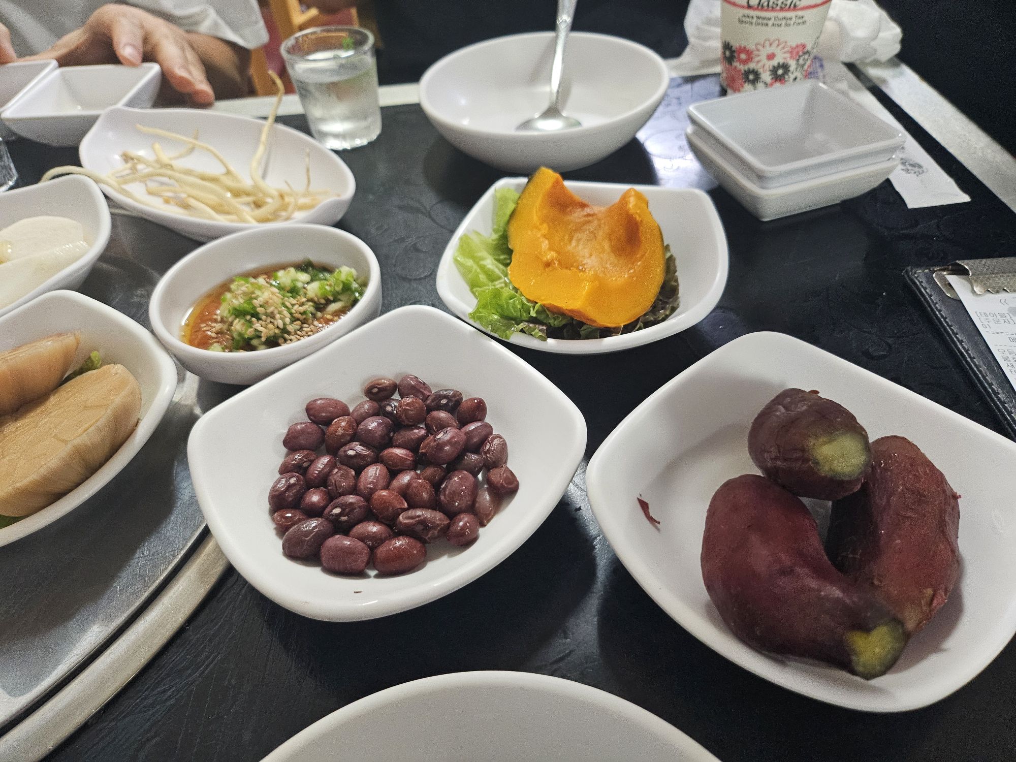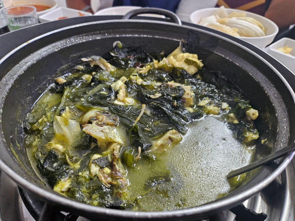 With many of the local small restaurants, you will be served a bunch of side dishes, which is not usual in the bigger Korean restaurants. We had pickled garlic in halves, nurungji, which are burnt rice, steamed sweet potatoes, steamed pumpkins, roasted peanuts, dried pollack strips and lettuce. There were also spicy cabbage kimchi and white cabbage kimchi provided, and mid-meal, the nice ahjuma also gave us a pan-fried fish