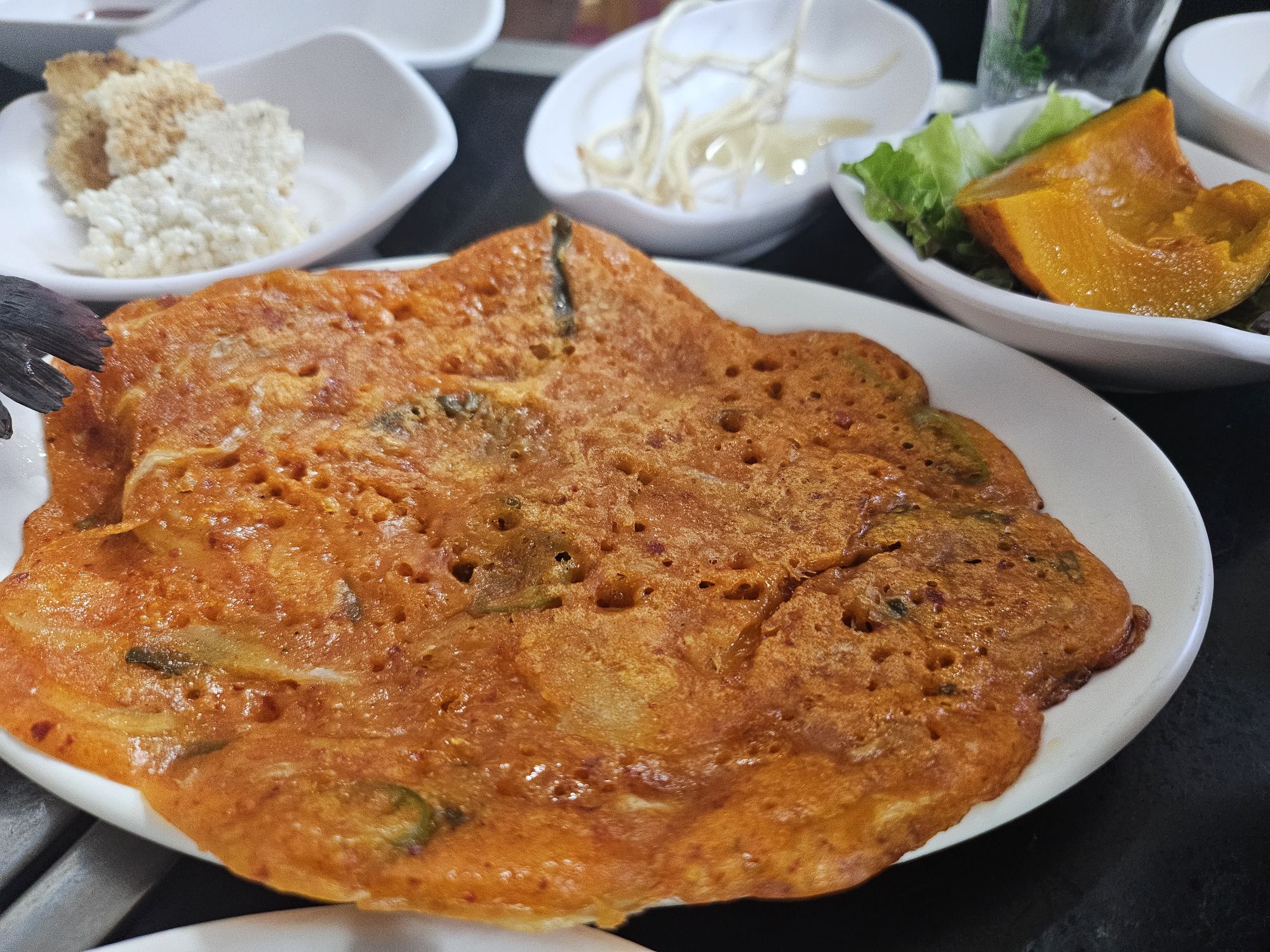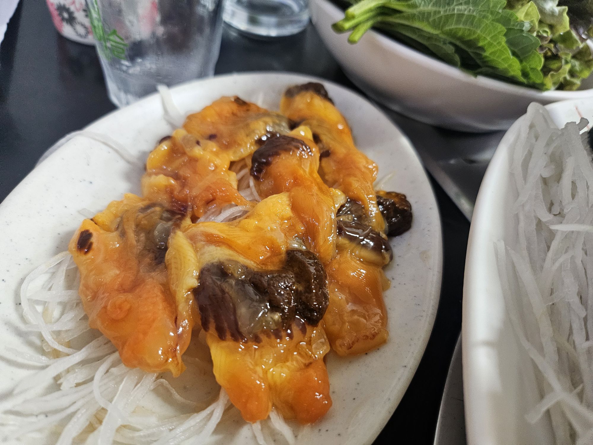 I couldn’t figure out if this was part of the set, a side dish or plainly a service dish (complimentary) as the lady kept putting things on our table and speaking in Korean. This was a very traditional homemade kimchi pancake, as the dough was chewy and soft compared to the crispy ones. There was kimchi and some other vegetables inside the pancake, and it was perfect as a drinking snack. There was also a plate of seafood, which the Koreans call sea grapes or sea pineapple, and we also added that to the mulhoe for variety