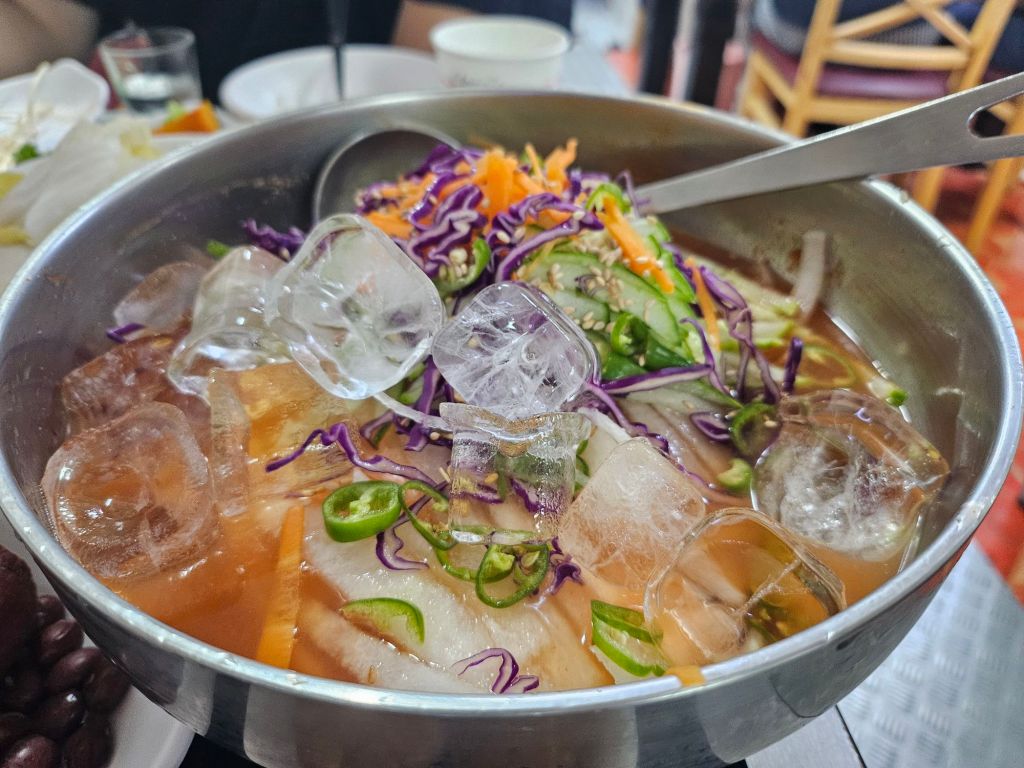 The next dish was the main highlight for me, the mulhoe, which is a traditional Korean cold raw fish soup, popular in summer for its refreshing, spicy, and tangy flavour profile. It was served in a silver pot with squid, crunchy vegetables like cucumber and pear in a chilled, seasoned gochujang broth, where we added the sashimi fish to the soup to make a complete dish. There were also noodles that you can add to the dish for a cold noodle dish. After my first taste, I can officially declare this dish as my favourite Korean noodle, even more than my beloved kong guksu. The texture of the fish slices provided the chewy bite, while the vegetables gave a nice crunch to the soft, smooth noodles. The broth was both spicy and tangy which makes every bite so addictive that I could not stop getting multiple servings. The ice cubes also make this dish a super refreshing dish during hot summers