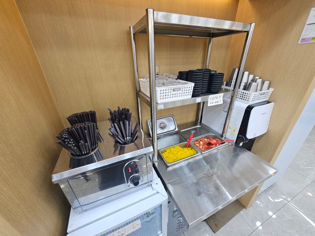 There is a self-service counter set up at the corner where customers can get their sanitised utensils, plates for side dishes like kimchi and pickled radish, as well as cups for ice water from the water dispenser