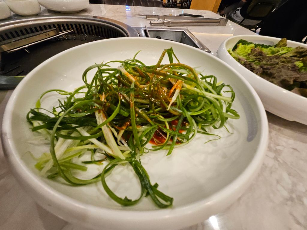 Since I was eating alone, my table was huge and could house many plates at the same time. There were many side dishes served: corn salad, kimchi, spicy spring onion, japchae, seasoned spinach, seasoned chilli and onions