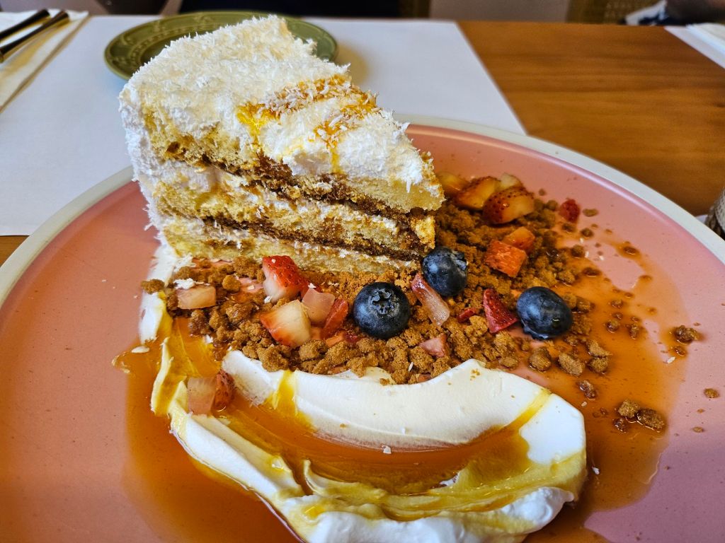 We wanted to try the putu piring cake, but it was sold out, so we got the ondeh ondeh cake, which came with shredded coconut, crumbs, and fresh fruits, as well as drizzled with gula melaka sauce. The cake was rich and nutty and was soft with an explosion of gulu melaka flavours, both from the sauce and the cake fillings