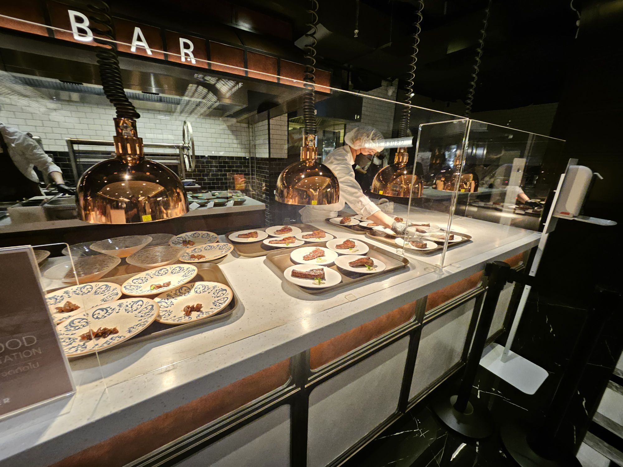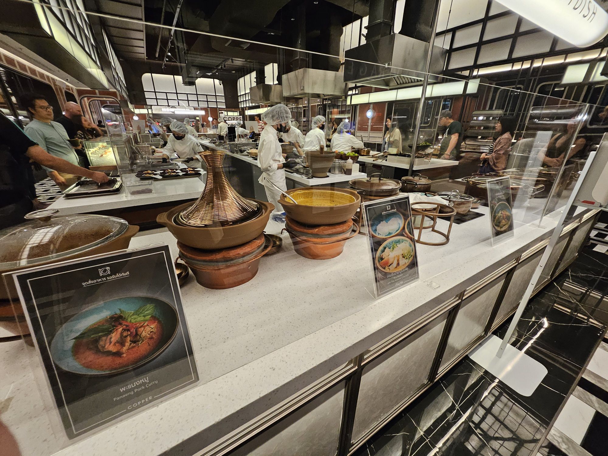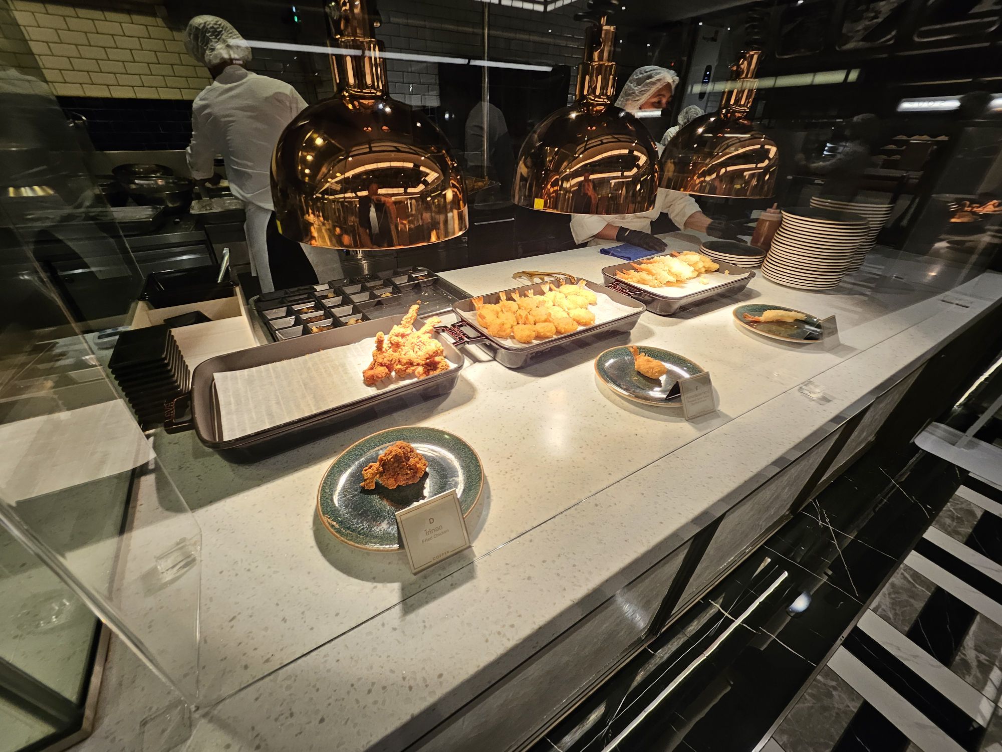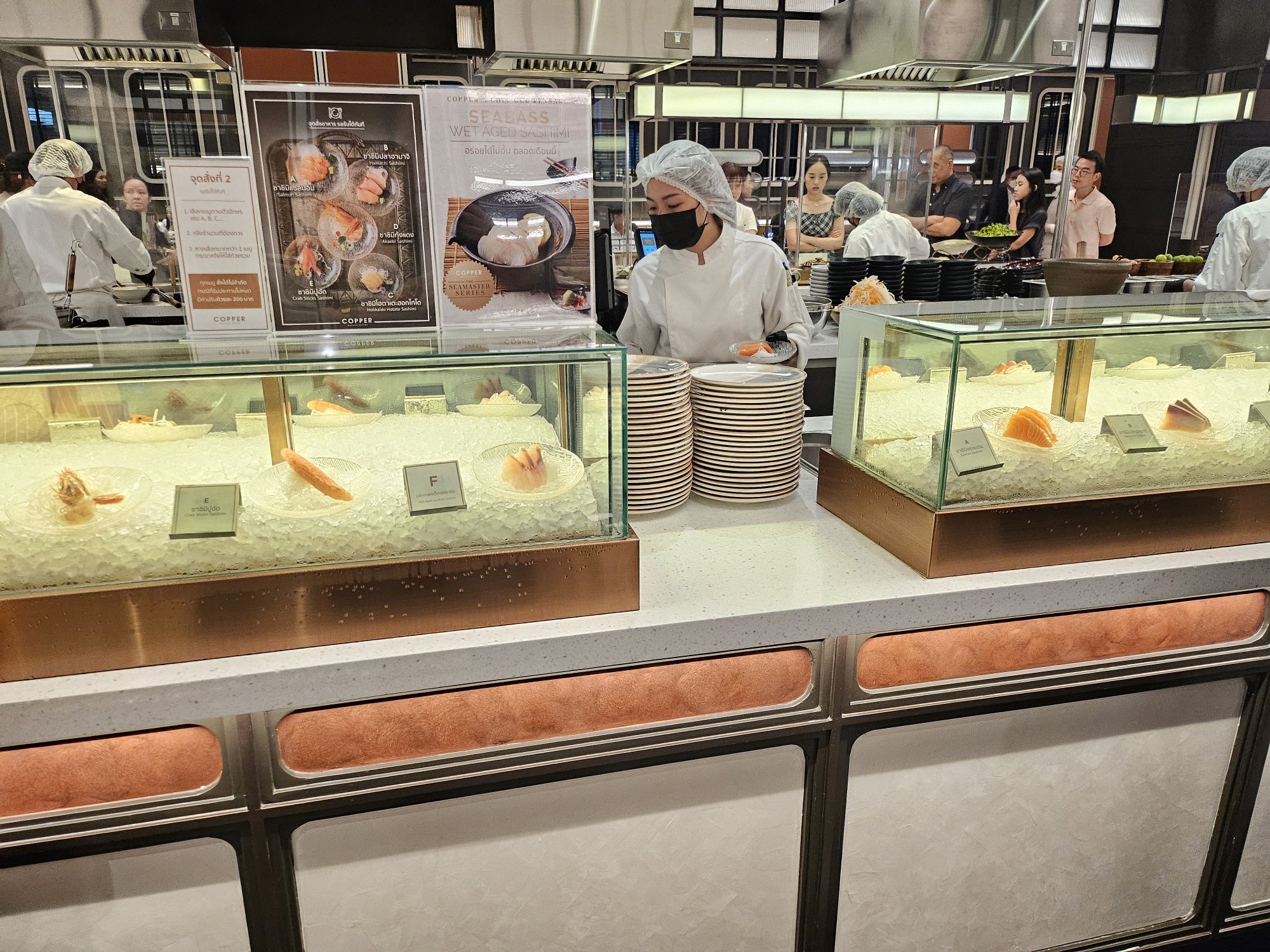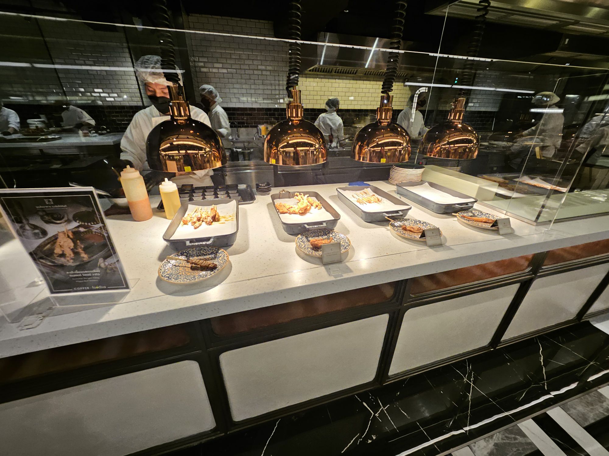 Located in Amarin Gaysorn, Copper Beyond Buffet takes on a very classy and opulent decor with modern and chic aesthetics. The combination of black and white tiles against gold and dark wood furnishings resembles the restaurant of a 5-star hotel. The restaurant has an open kitchen concept where chefs cook the dishes behind glass counters
