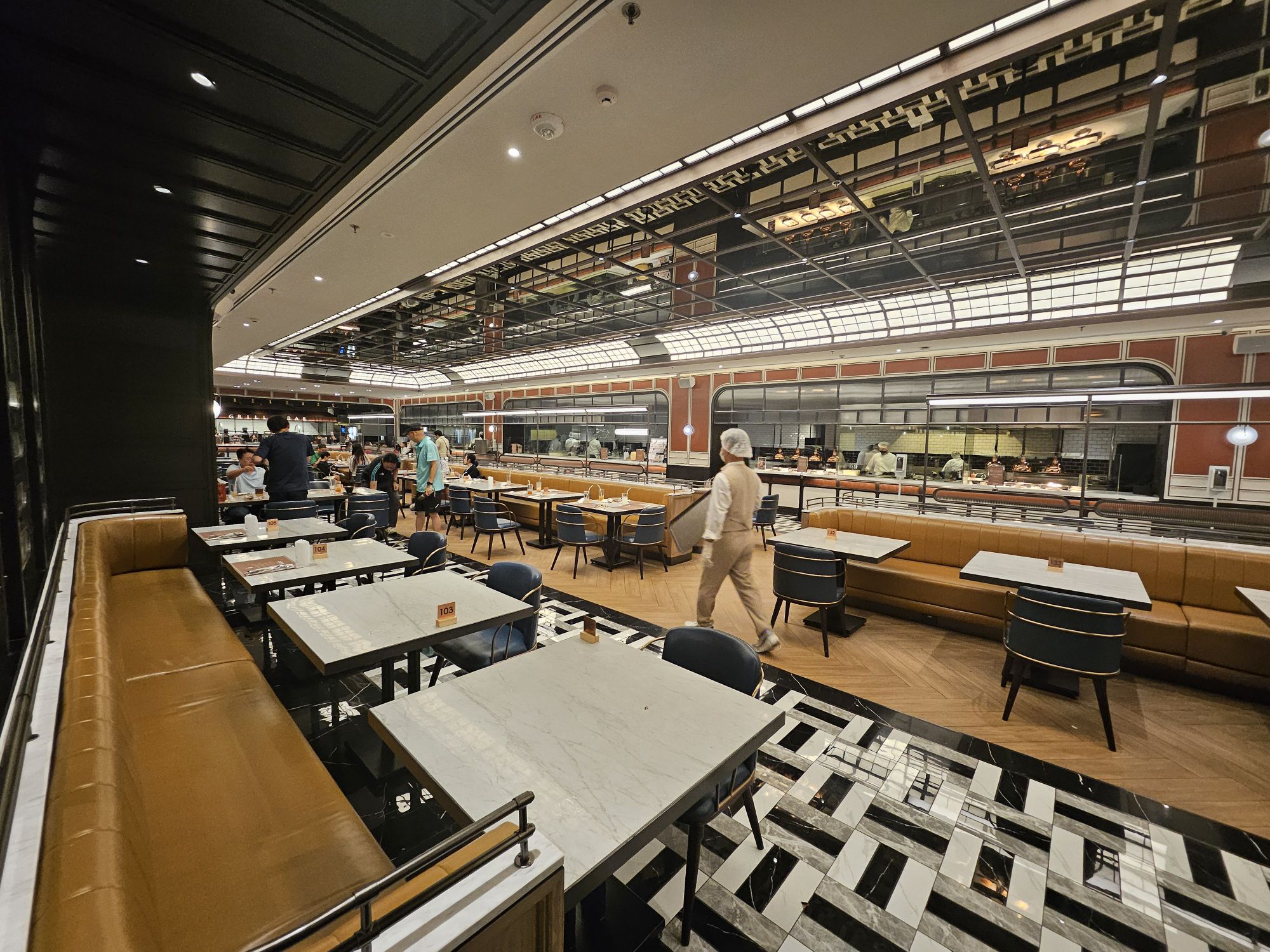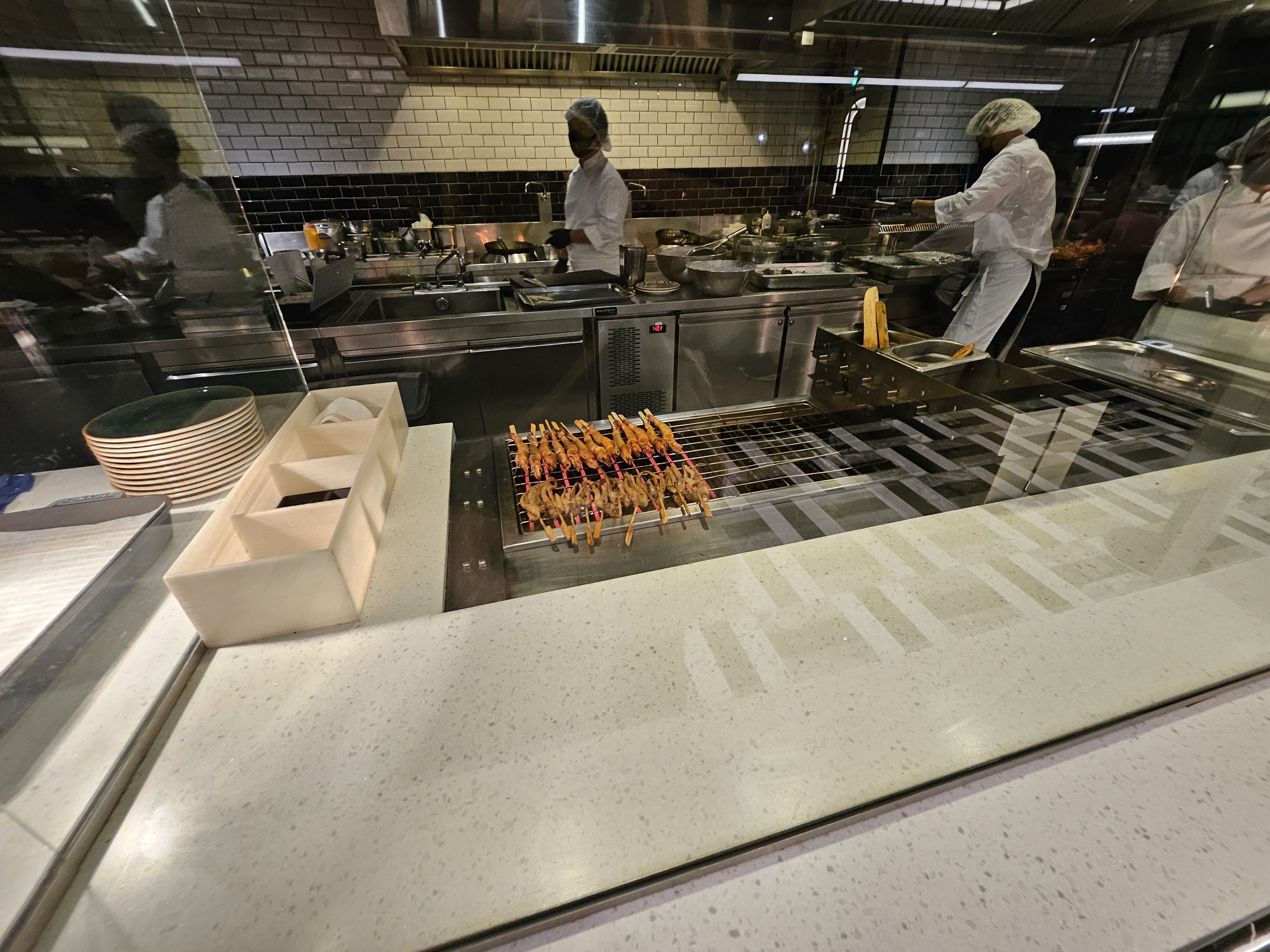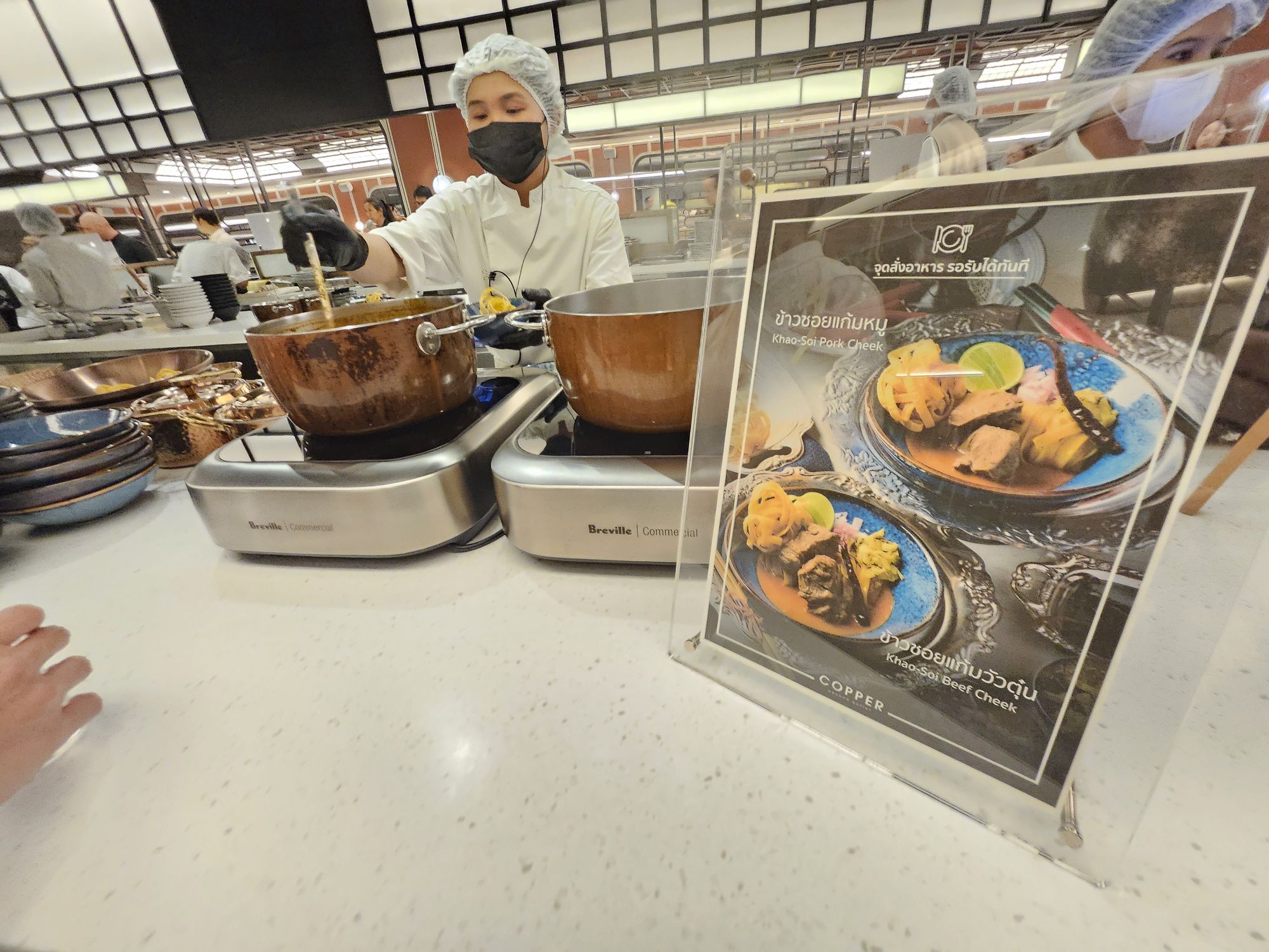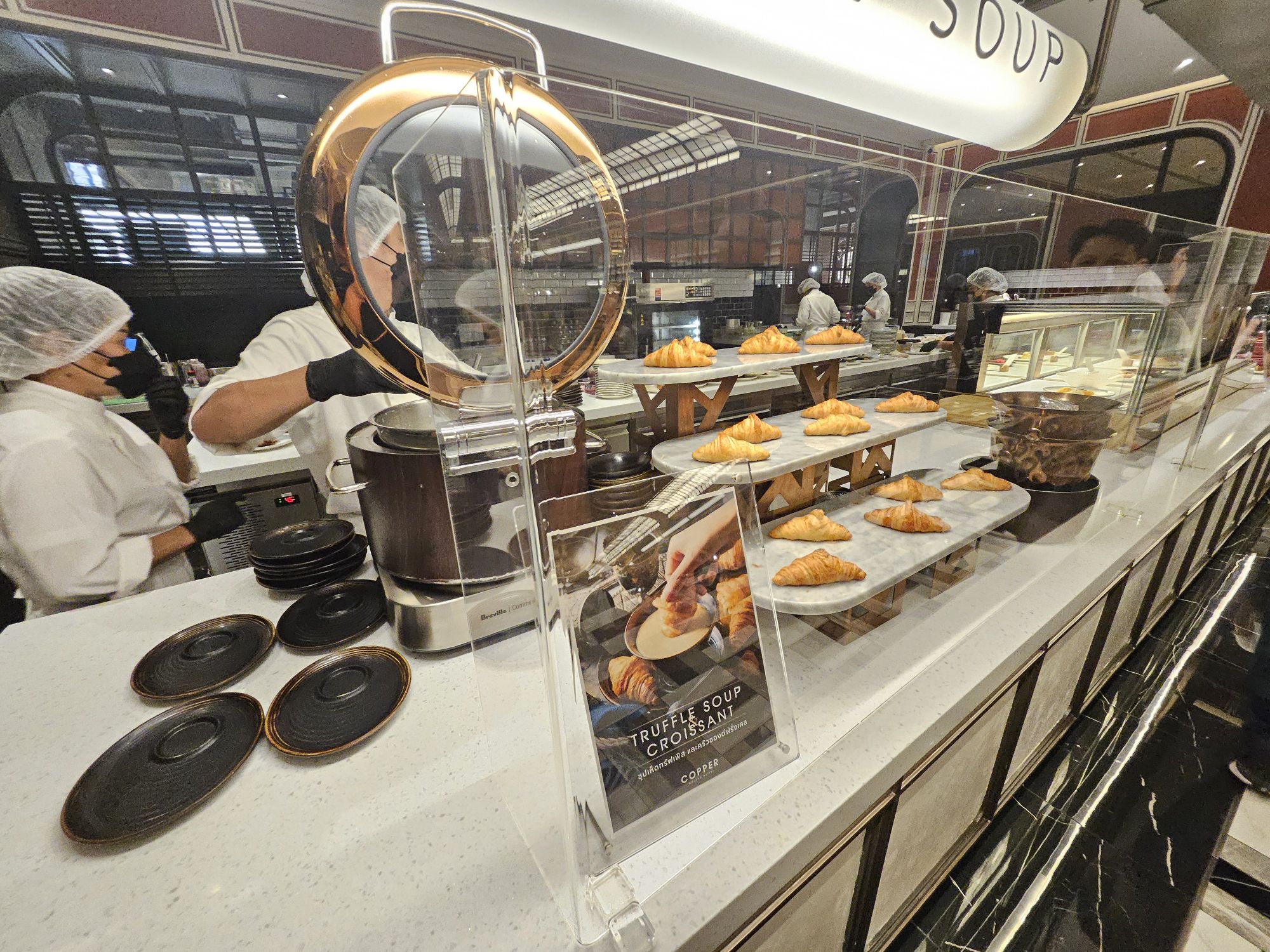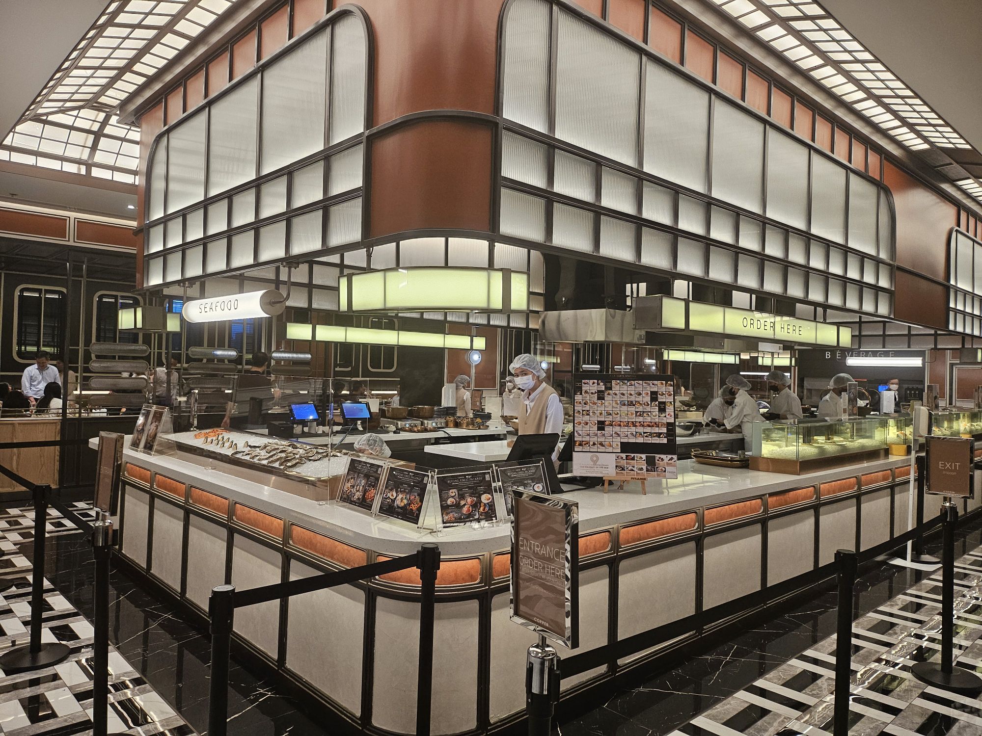 Located in Amarin Gaysorn, Copper Beyond Buffet takes on a very classy and opulent decor with modern and chic aesthetics. The combination of black and white tiles against gold and dark wood furnishings resembles the restaurant of a 5-star hotel. The restaurant has an open kitchen concept where chefs cook the dishes behind glass counters