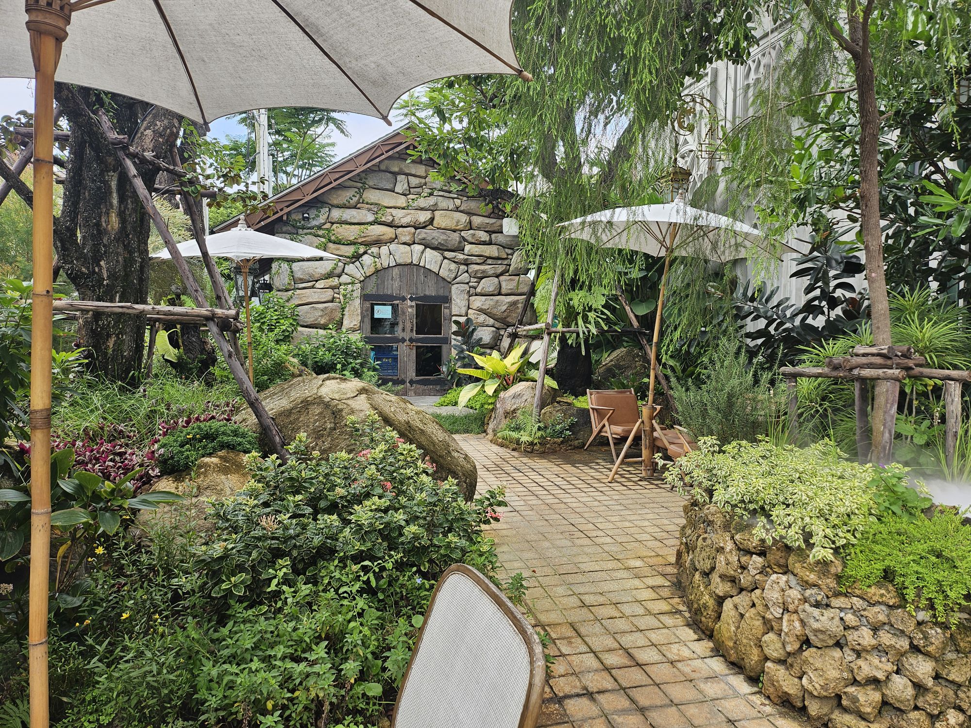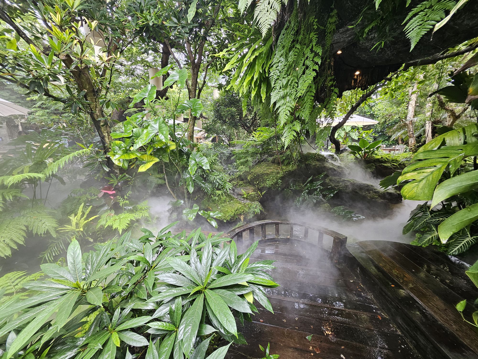 From the doors leading to the outdoors, you are taken into an entirely different fairytale world of green landscape with multiple ponds, koi fish, diverse flora and a misty atmosphere, creating a romantic and whimsical escape from the chaotic city