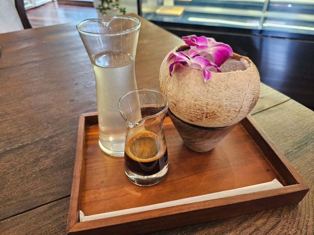 When it comes to the menu, the restaurant offers a mix of authentic Thai, Italian, and brunch-style dishes, and the prices are definitely higher than those of other restaurants. I spotted an interesting drink and ordered it. They had the coconut espresso coffee, which I have recently fallen in love with, and since we are in the land of coconuts, this must be sweet and delicious. The whole brown coconut was served with a small cup of espresso and an empty glass, so you can do your own mix of coconut water with coffee. The coconut water was sweet and paired well with the bitter yet smooth espresso