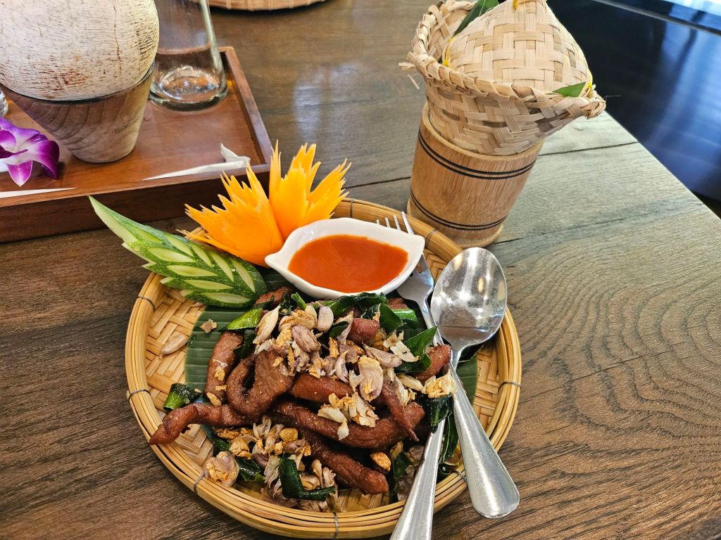 I ordered a sun-dried pork neck with glutinous rice, as this was one of my favourite local dishes. The price is about THB 400, which is typically higher than at basic Thai restaurants. The pork was well-cooked with authentic flavours, and the chilli had a nice tangy spice, which paired well with the pork strips