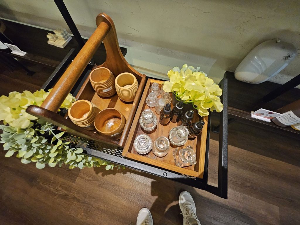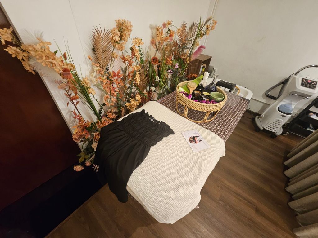 There were more than 2 floors of rooms for services, and I was glad mine was on the 2nd floor only. All rooms are made for dual use, which was stated on the website during booking, so you might need to share the room with another person if you are alone. The bed was all prepared when I entered with a disposable bra top and an expandable tube top to be worn, so you are not exposed fully. There was also a tray of herbs and flowers prepared for the session