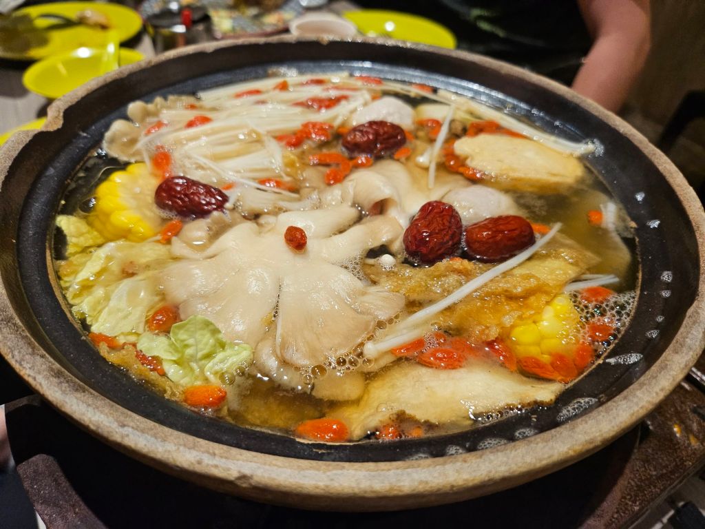 The steamboat was served in a hot claypot, which kept the soup hot and bubbling on top of the portable stove. The set came with the usual mushrooms and vegetables, and since we opted for the herbal soup base, we could see the herbs floating about the soup. Different steamboat combos feed different numbers of people, and like traditional Chinese steamboat, the sets come with vegetables, mushrooms, meat, fishballs, basic seafood and some beancurds
