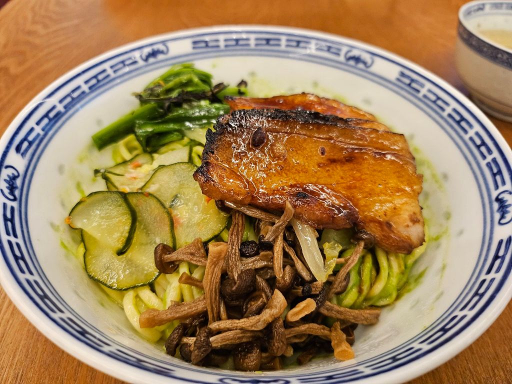 My colleague had the Emerald Dragon, which is made up of braised preserved salted vegetables, qing long vegetables and spring onion pesto sauce on top of handmade noodles. There is a choice of toppings from beer-braised pork belly (RM26) or poached chicken slices (RM24). You can top up mala for this dish to make it spicy by adding RM 6. The pork belly was melt-in-your-mouth, and the pesto sauce gave it a nice garlic flavour from the spring onions. I think the noodles were a little dry and would be better with more sauce