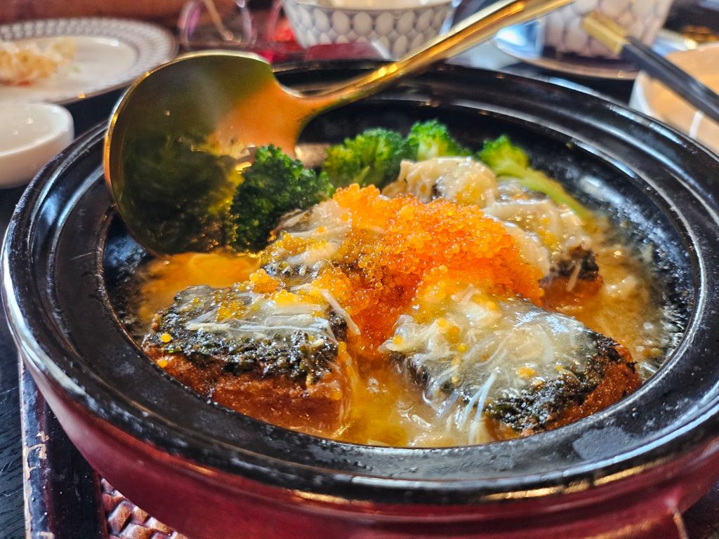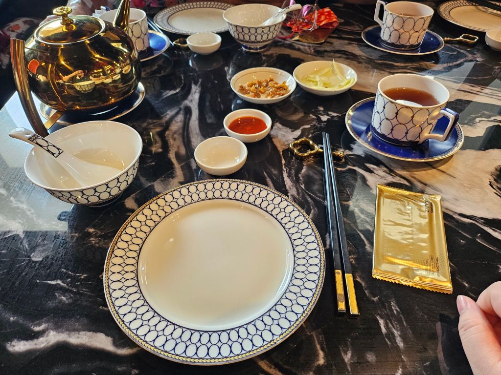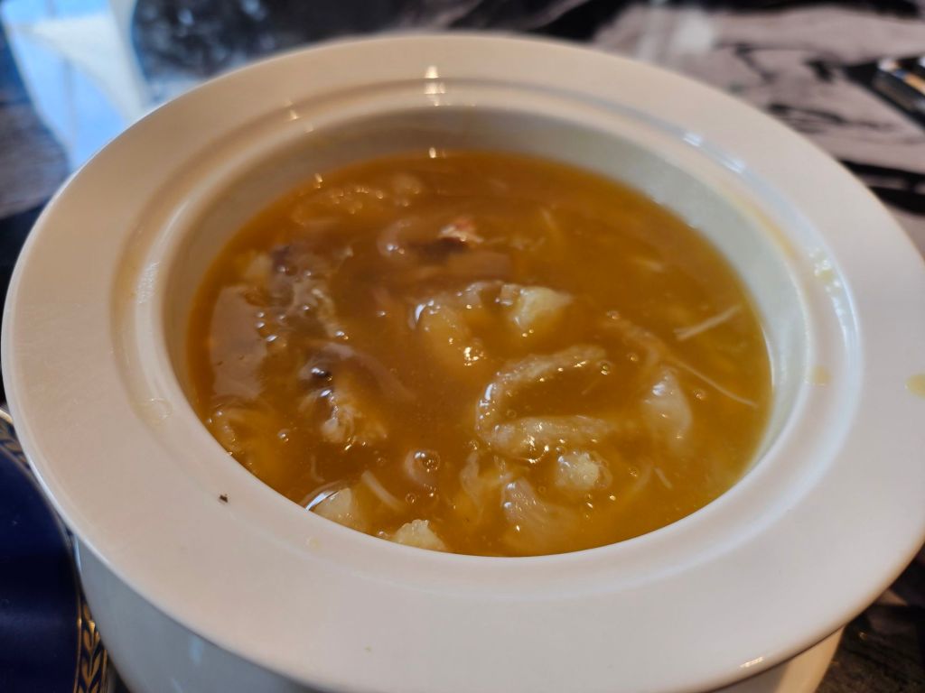 The table setting was elegant with lavish China, golden teapots and a marble table. We started the meal with a fish maw soup, which was served in a nice porcelain bowl, keeping the soup warm. The soup was thick with a nice savoury broth and generous toppings of seafood
