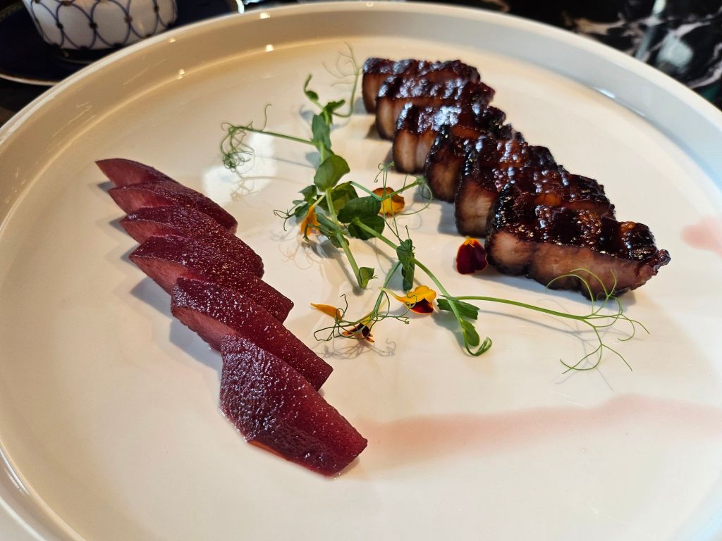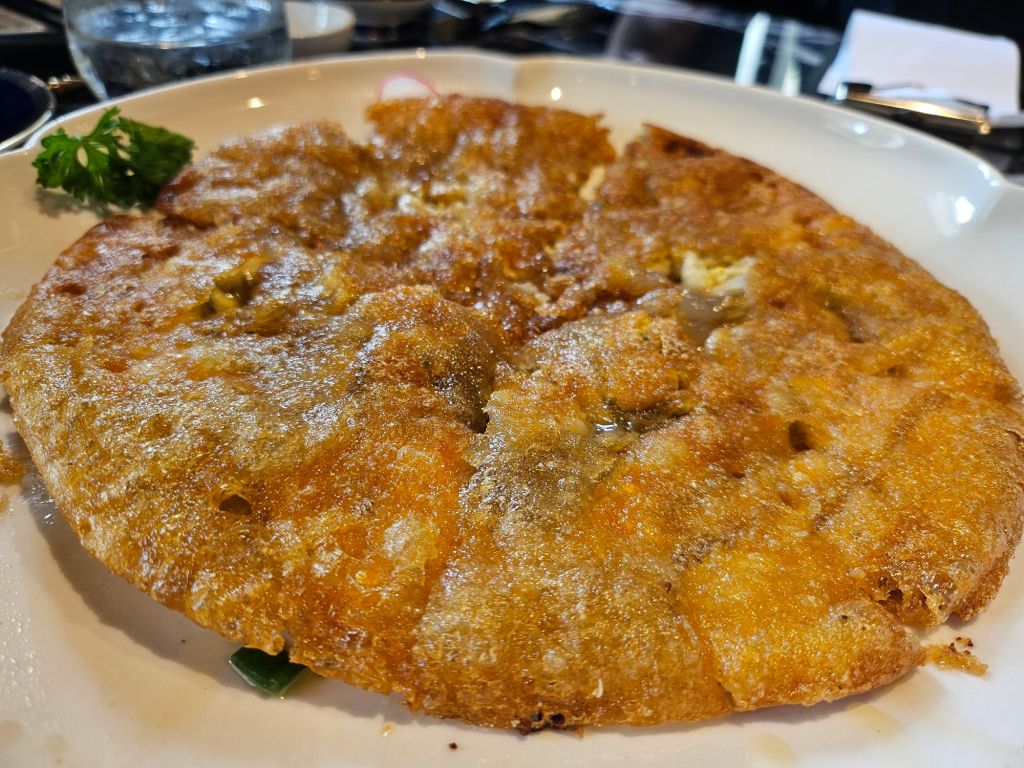 We had the grilled kurobuta pork char siew served with plum pickled radish, crab meat and crab roe with homemade tofu and Teochew-style pan-fried oyster omelette. The pork was tender and has the nice charred edges, which I love for my char siew. The pickled vegetable on the side helps to balance the grease from the meat. The tofu was soft and flavourful with the fresh sweetness of both the crab roe and meat, giving it the additional pumo of umami. The omelette came last as it was ordered at almost every table. The result was an extremely crispy omelette with a burst of oysters in between each bite