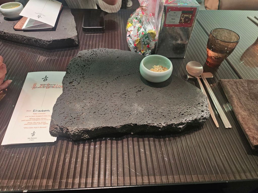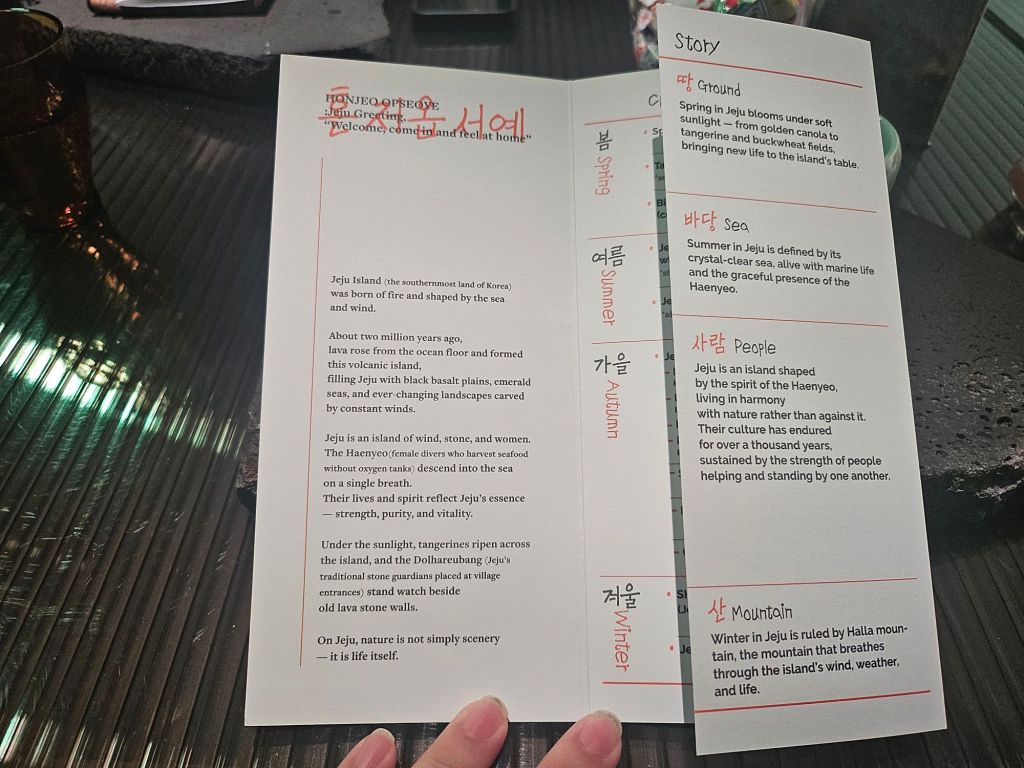 Each seat was set up with a piece of stone as the placemat, which reminded me of the Jeju volcanic stone, and a welcome note addressed to each guest with their name. Another brochure was placed on the table, which explains the storyline of the whole experience today. Together with the performance, dishes and videos, they will showcase highlights of Jeju through the different seasons as well as the key elements of the island like the sea, people, mountain and the ground, which are all connected to form the spirit of Jeju island