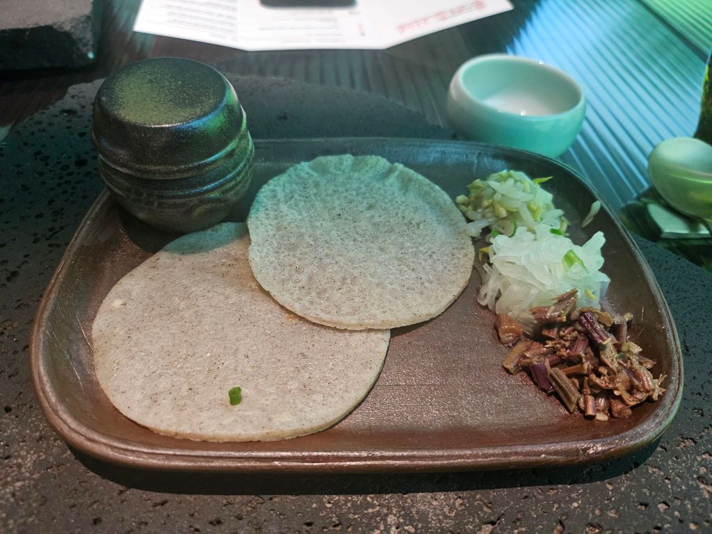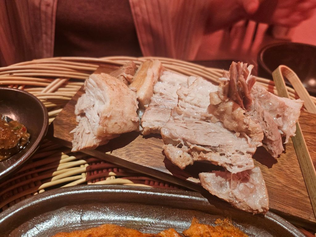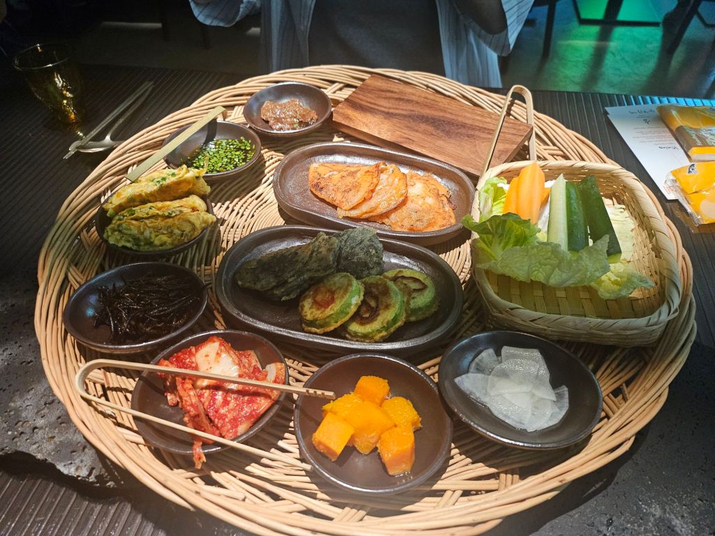 We also had the Korean buckwheat pancake, known as Bing-tteok, which showcases local ingredients like buckwheat flour, radish, and summer vegetables from the ground. We wrap the ingredients into the thin pancake like a crepe before eating it. Other than seasoned radish, there was also mugwort and beansprouts and some seasoned burdock. The flavour of the pancake was simple and earthy, and very light on the stomach as there was no grease. It was a good introductory dish to layer the stomach before the heavy dishes