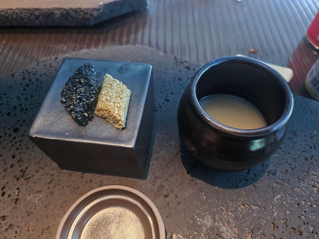 The final course depicting Winter was the desserts, which included 2 types of rice cake and a cup of rice wine, Makgoli. One of them was dipped in black sesame, while the other was white sesame. The rice cake was soft and chewy with a strong nutty flavour from the sesame seeds, while the lightly sweet makgoli helped to wash down the sweetness of the dessert